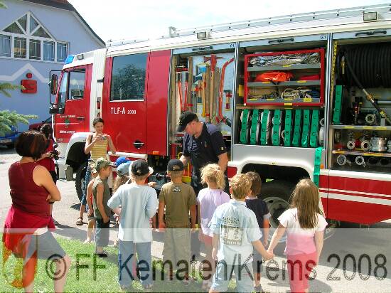 Die Kinder und Betreuerinnen wurden zuerst im Kommandoraum begrüßt und bekamen einen kleine Einschulung über die Tätigkeiten der Feuerwehr, das Absetzen eines Notrufes sowie weitere interessante Tatsachen. Danach gab es die Schautzausrüstung (Einsatzjacke- und Hose, Handschuhe, Schutzstiefel, Helm, Feuerwehrgurt) unter fachmännischer Erklärung zu betrachten. Bevor eine Fahrt mit den Feuerwehrfahrzeugen anstand, gab es diese noch zu begutachten - natürlich gab es auch hier für die interessierten Besucher wesentliche Informationen zu den wichtigsten Gerätschaften.