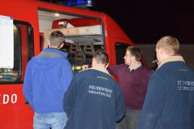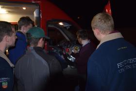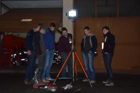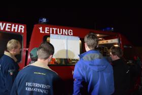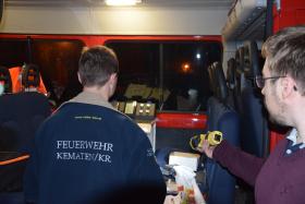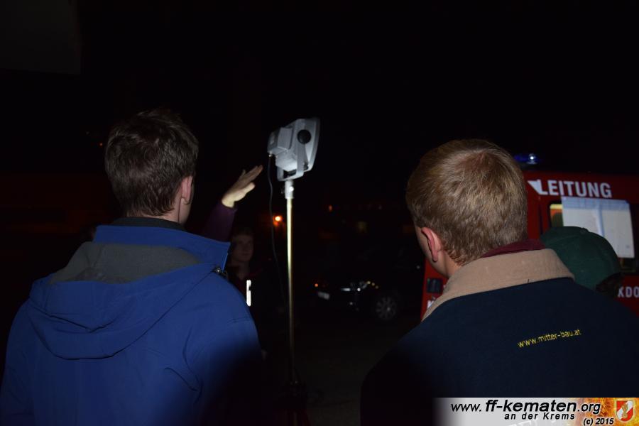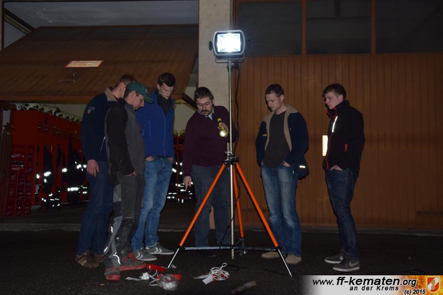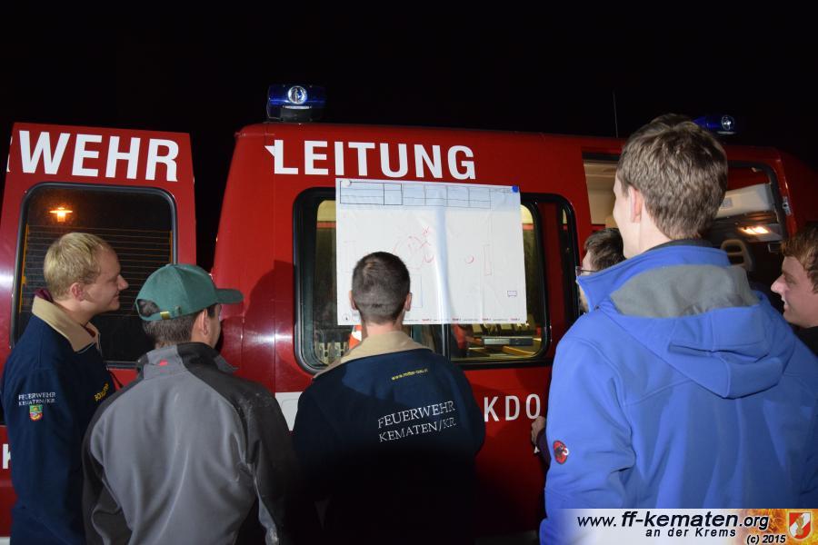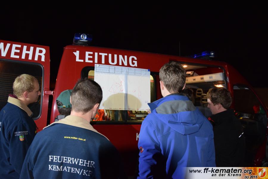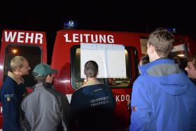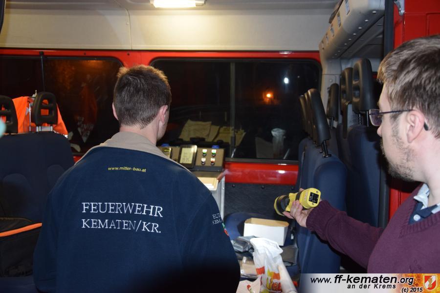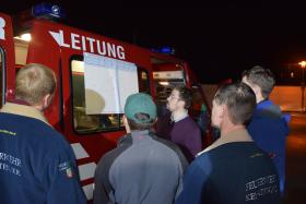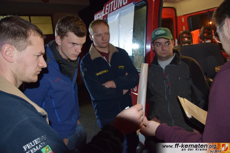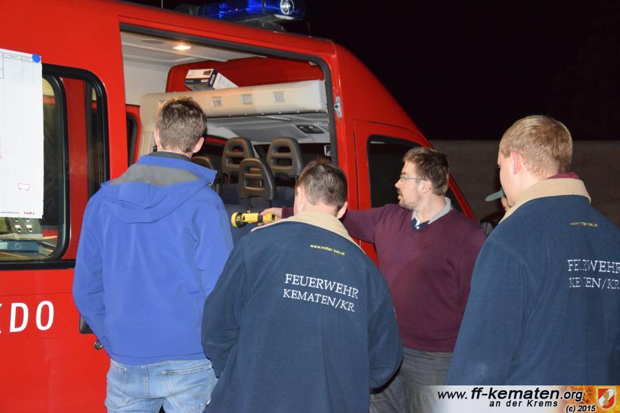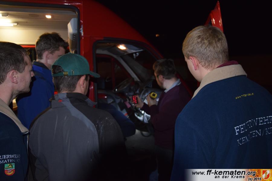 Bei der letzten Station wurden sämtliche Geräte im Kommandofahrzeug besichtigt und die Bedienung erklärt. Der neue LED-Scheinwerfer vom Spannungswandler im KDO betrieben lieferte das aufgrund der Dunkelheit notwendige Licht. Weiters wurde ein Augenmerk auf die Checkliste für den Aufbau einer Einsatzleitung gelegt. Die neu angekaufte Lagekartenlösung (Taktifol) wurde ebenso erfolgreich von der Mannschaft ausprobiert.