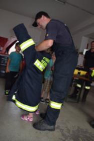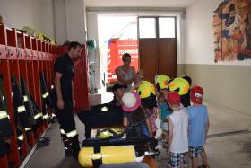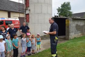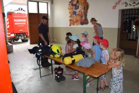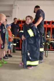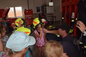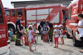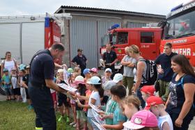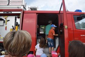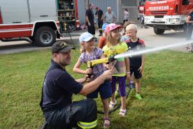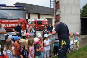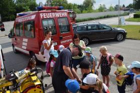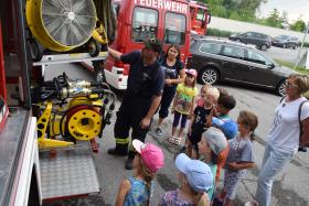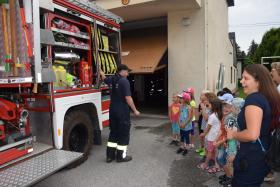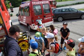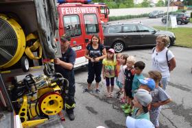 Nach kurzen Erklärungen der wichtigen Themen (Notruf, Feuerwehrwesen, usw.) in entsprechend für Kinder verständlichen Form wurden der Fuhrpark und die Geräte präsentiert. Danach wurde noch eine Rundfahrt mit den Feuerwehrfahrzeugen durchgeführt.