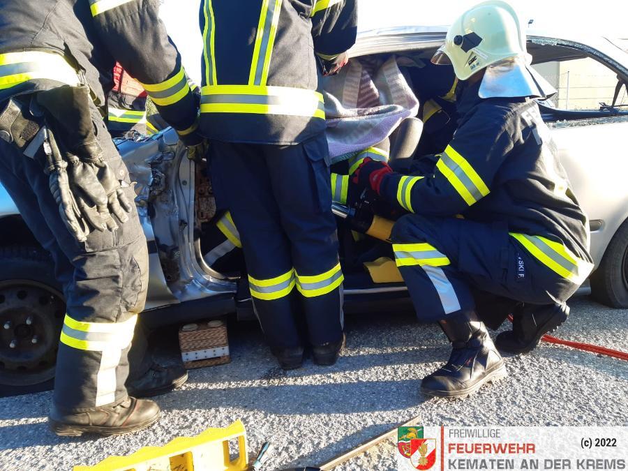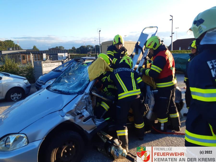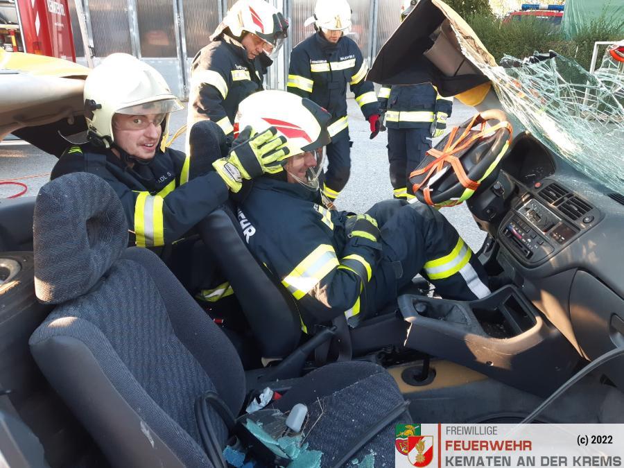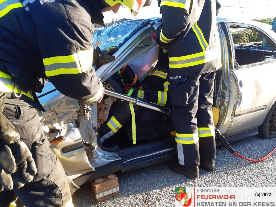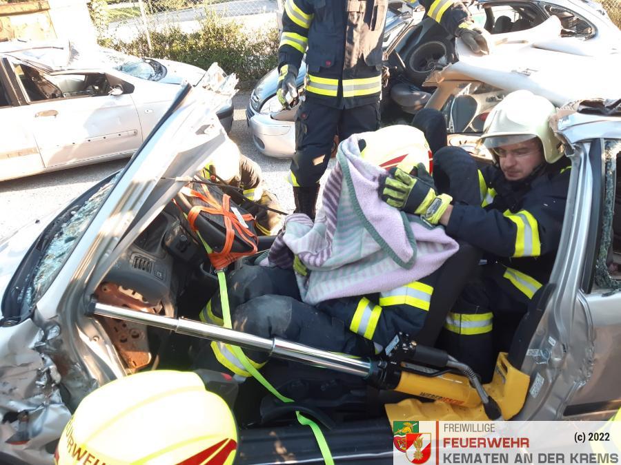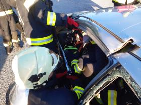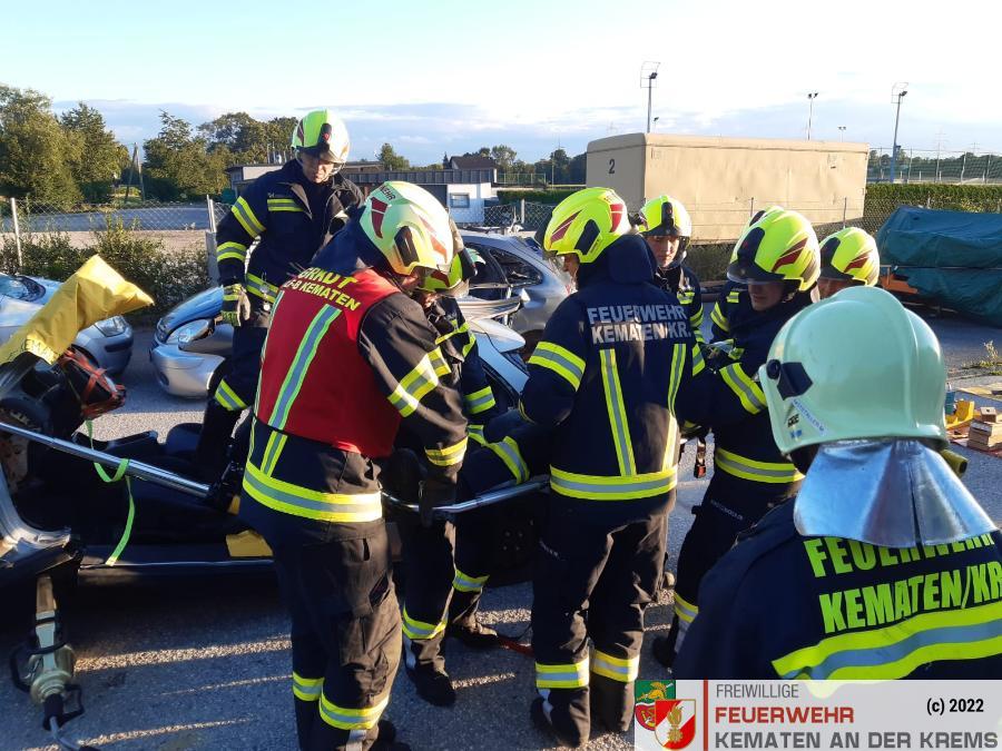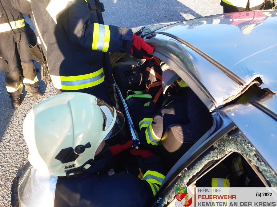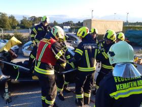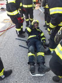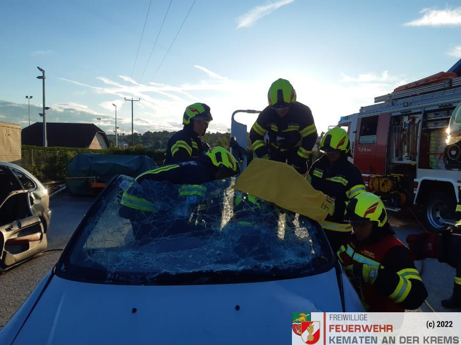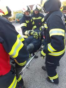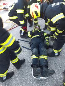 Nach der Absicherung des Fahrzeuges wurden die vorderen Türen entfernt, nachdem anschließend auch das Dach geöffnet und zurückgeklappt wurde, konnte die Personenrettung durchgeführt werden. Mithilfe einer Schaufeltrage konnte das „Opfer“ gerettet werden.
