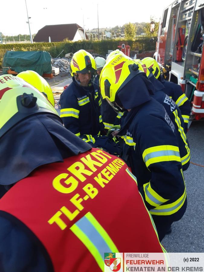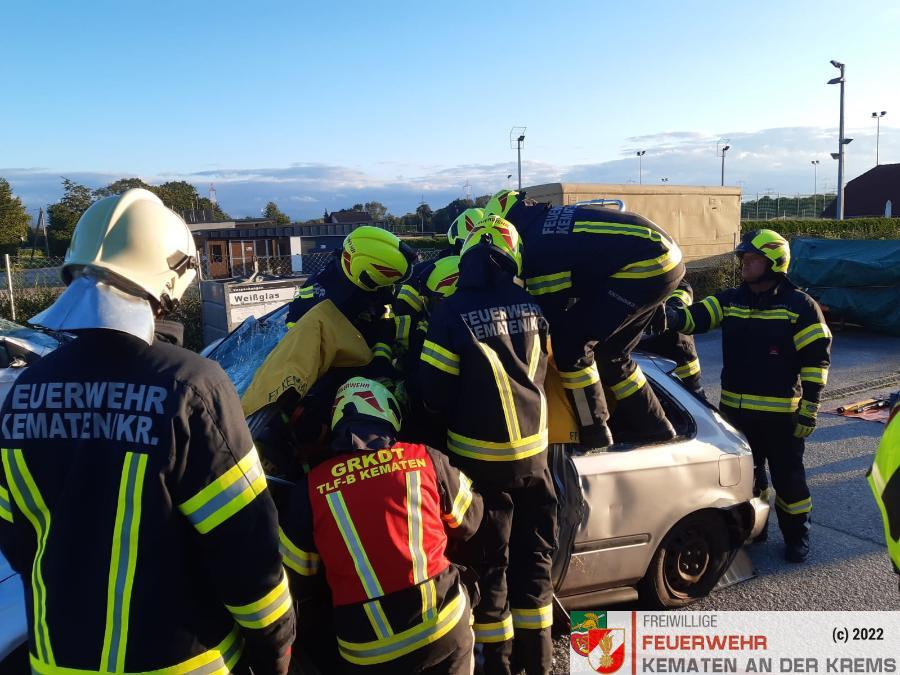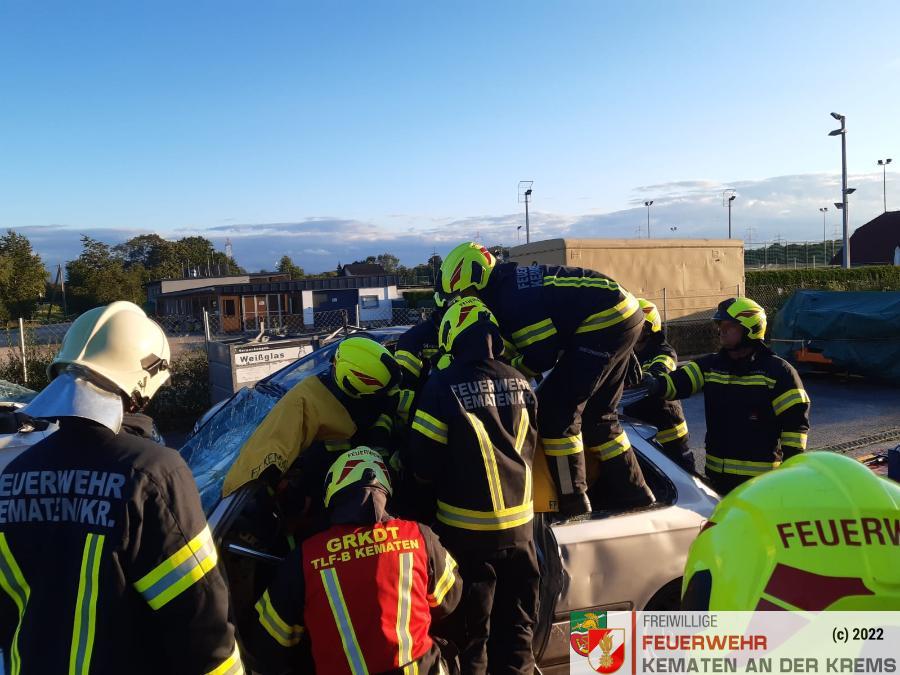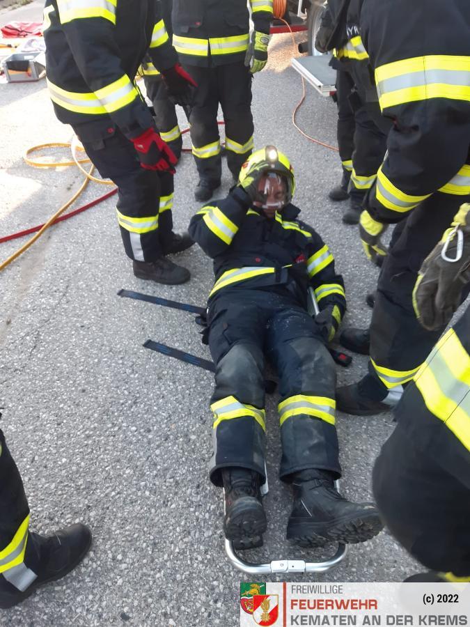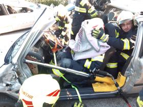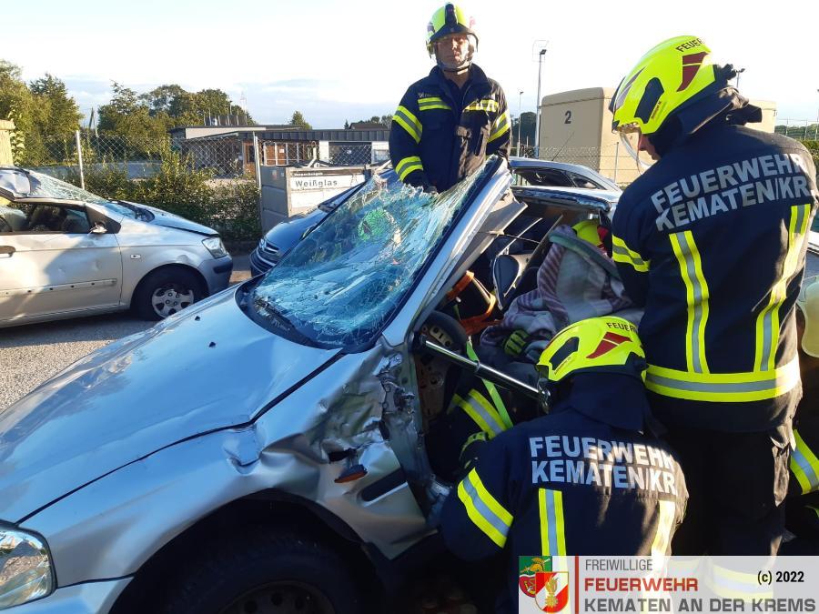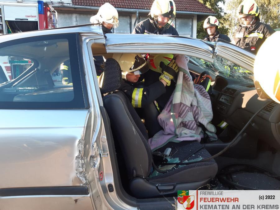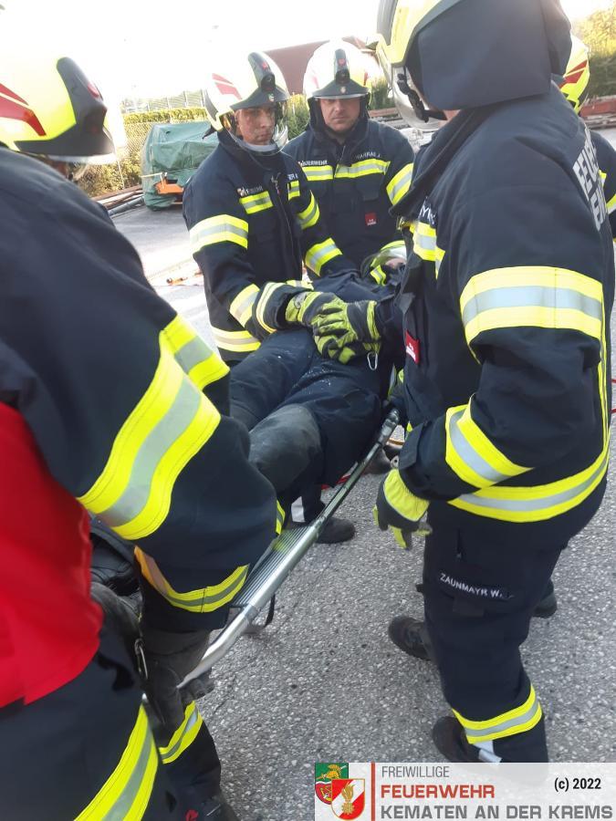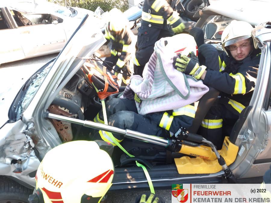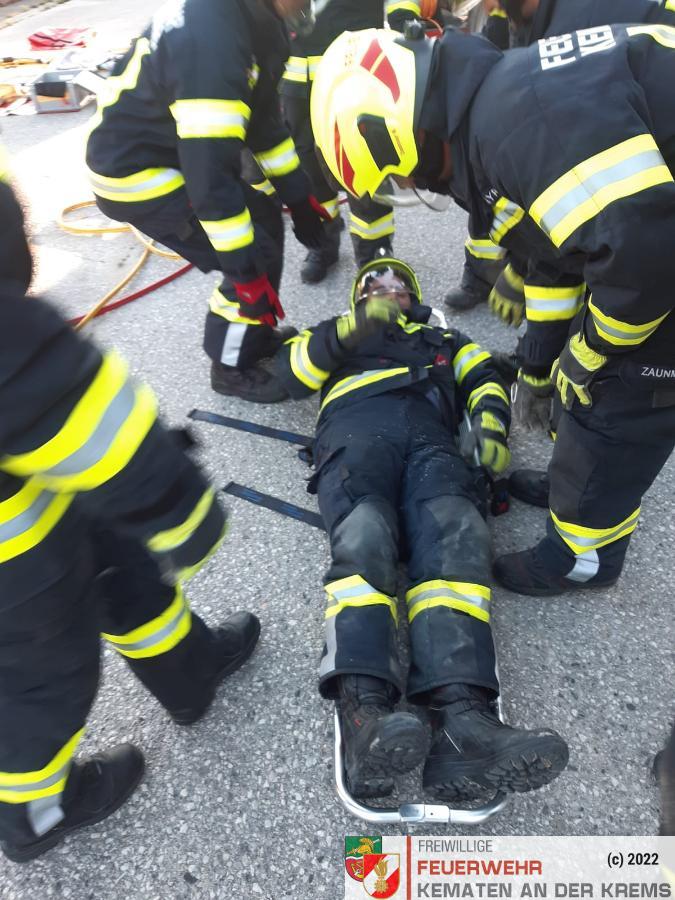Nach der Absicherung des Fahrzeuges wurden die vorderen Türen entfernt, nachdem anschließend auch das Dach geöffnet und zurückgeklappt wurde, konnte die Personenrettung durchgeführt werden. Mithilfe einer Schaufeltrage konnte das „Opfer“ gerettet werden.