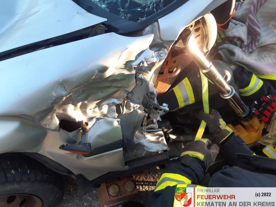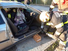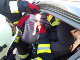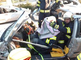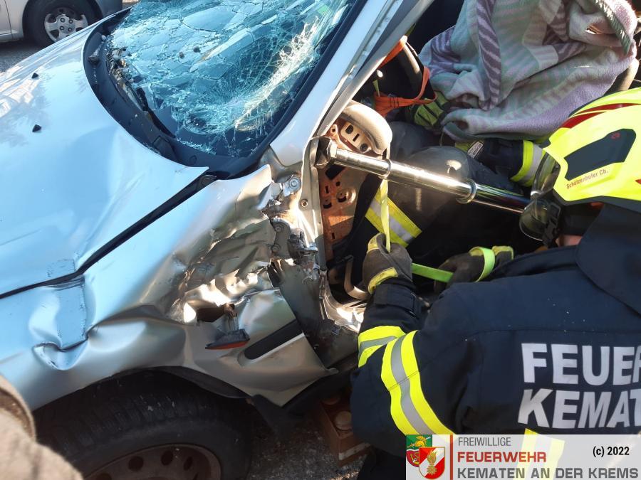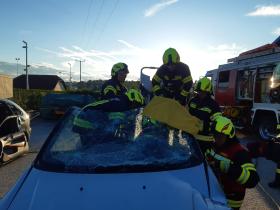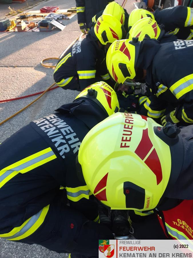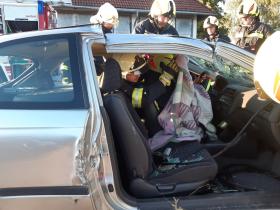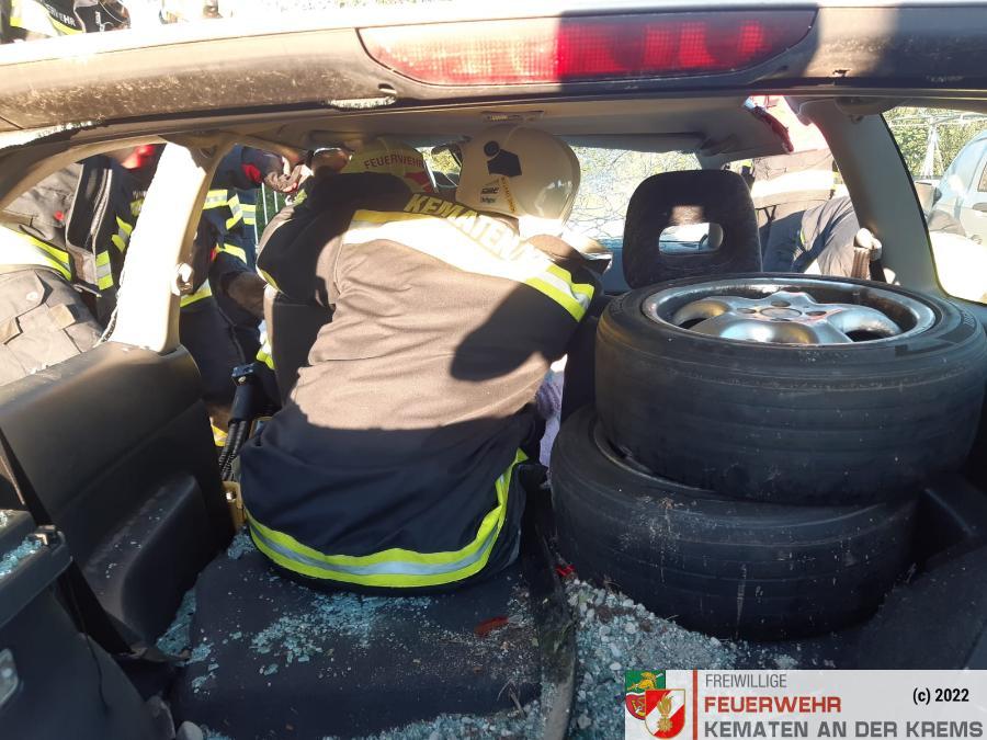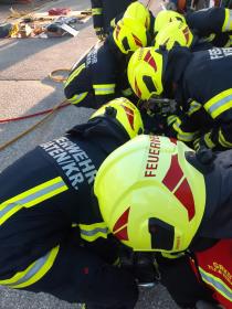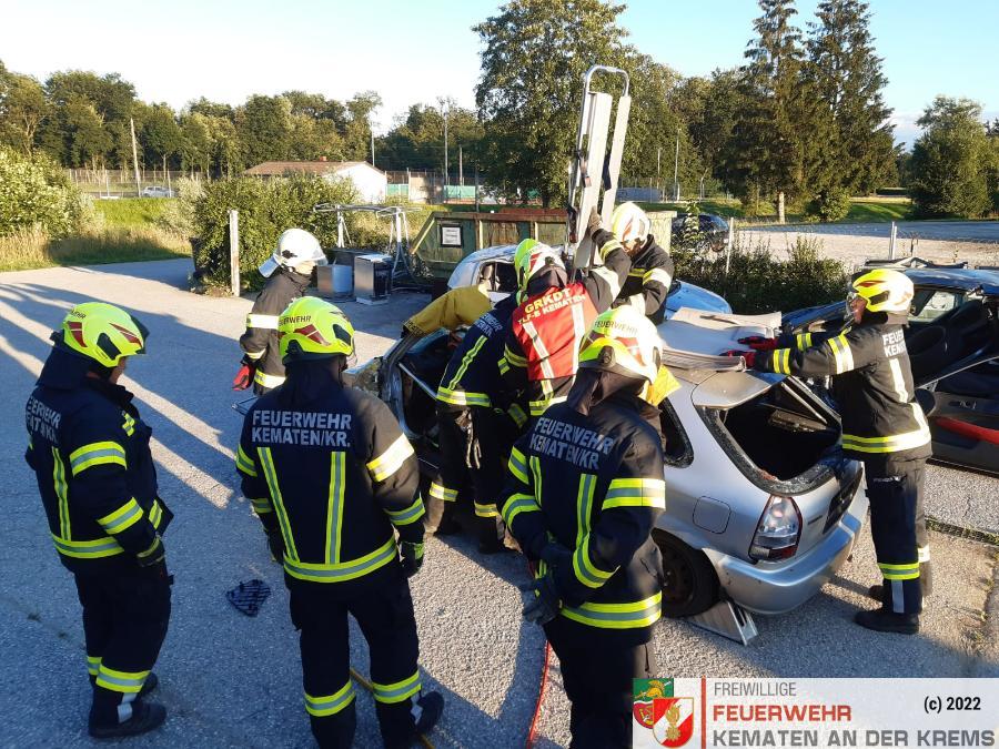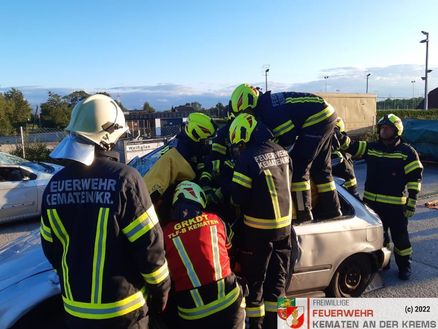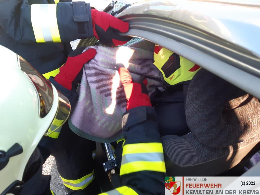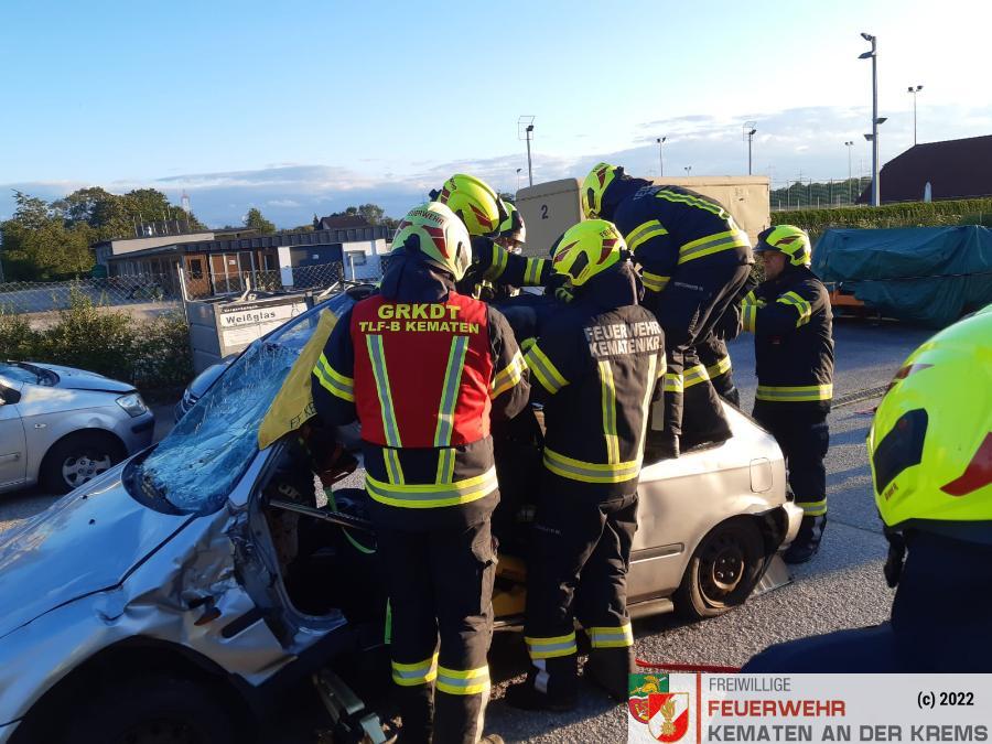Nach der Absicherung des Fahrzeuges wurden die vorderen Türen entfernt, nachdem anschließend auch das Dach geöffnet und zurückgeklappt wurde, konnte die Personenrettung durchgeführt werden. Mithilfe einer Schaufeltrage konnte das „Opfer“ gerettet werden.