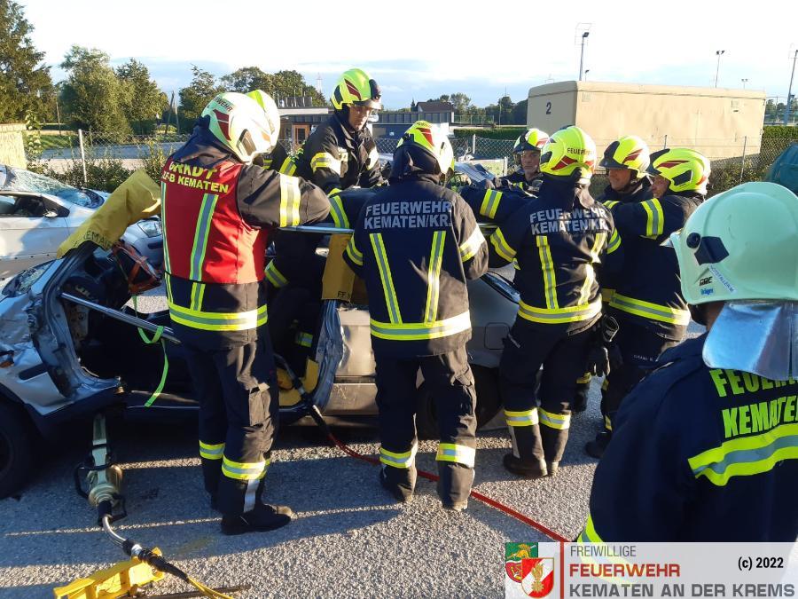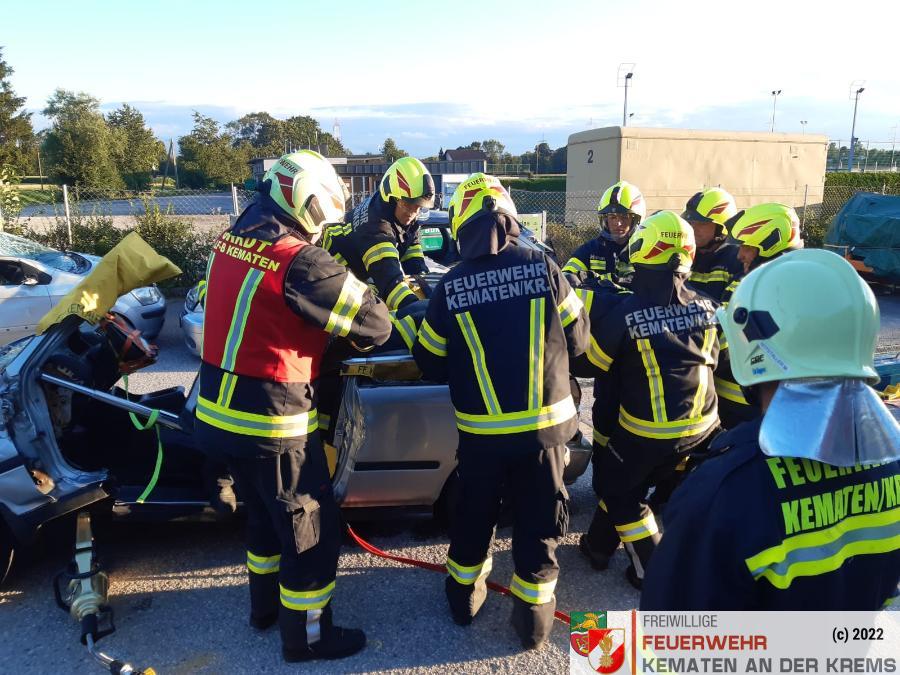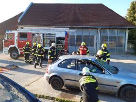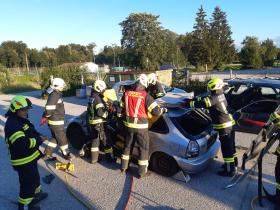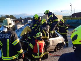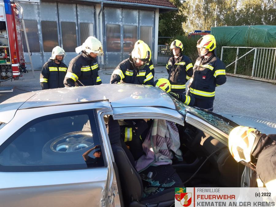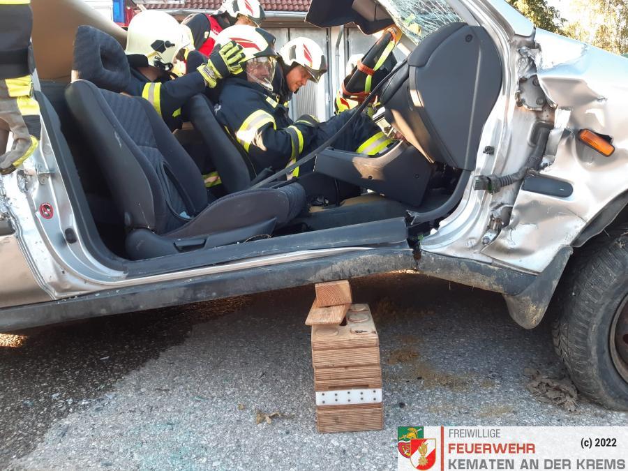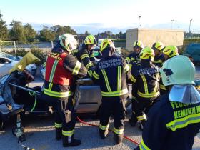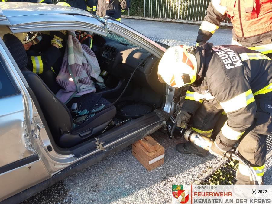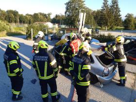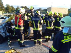Nach der Besichtigung wurde mit dem Fahrzeug noch geübt. Übungsannahme war ein Verkehrsunfall mit eingeklemmter Person.