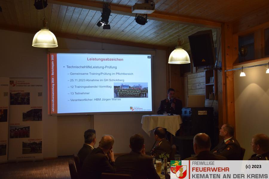 OBI Florian Schierl blickte auf die absolvierten Ausbildungen 2023 sowie auf die besuchten Lehrgänge 2023 zurück. Ein besonderer Punkt in der Ausbildung war das technische Hilfeleistungsabzeichen, welches wir seit langer Zeit wieder absolvierten.