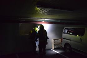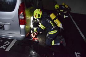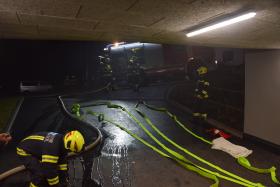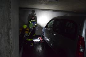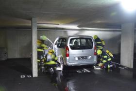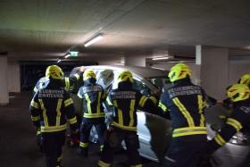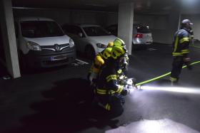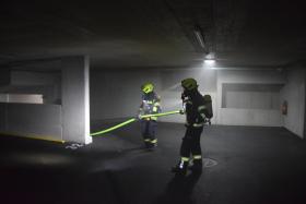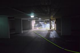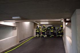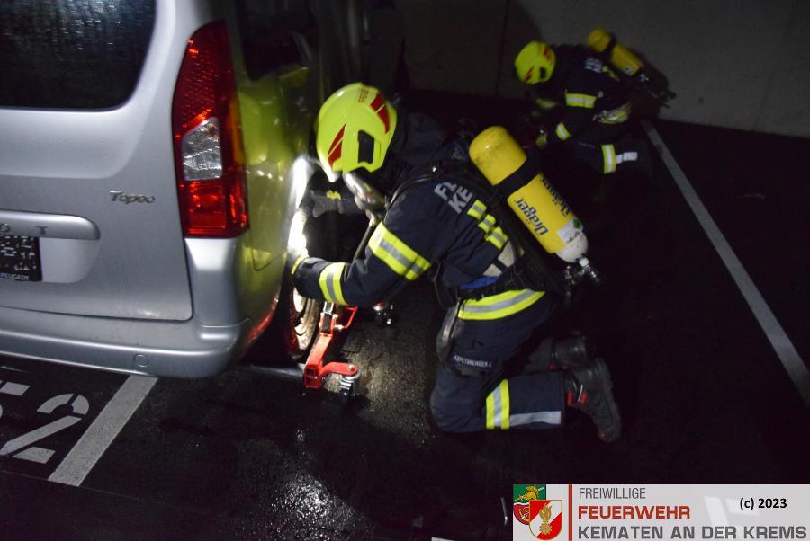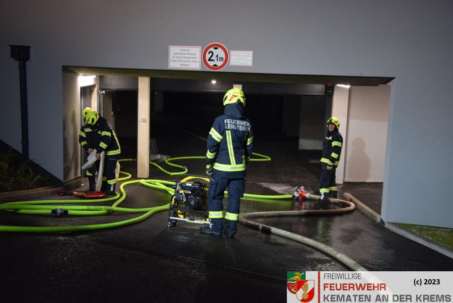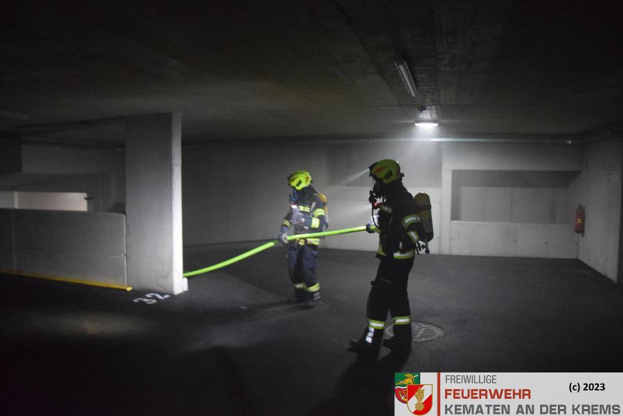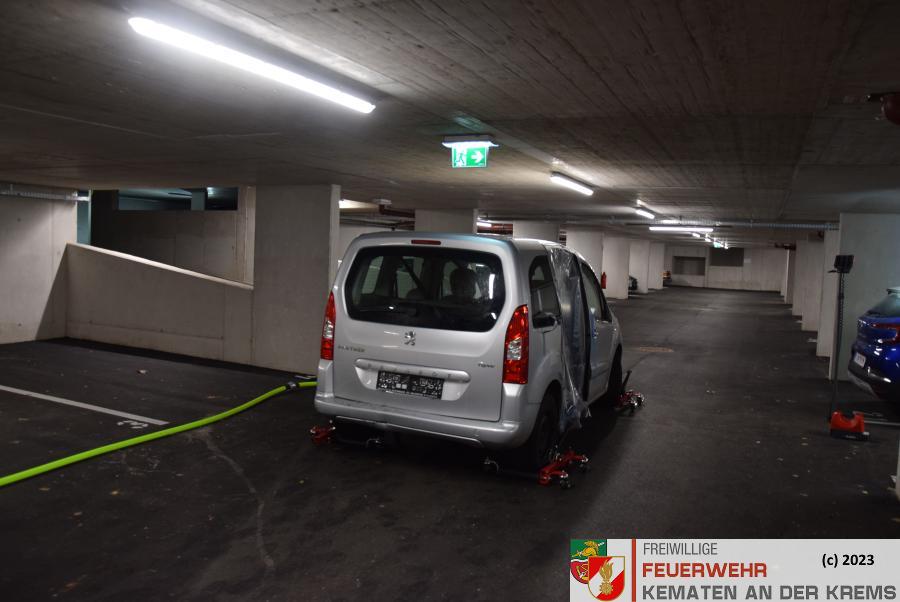 Da bei Elektrofahrzeugen die Gefahr zur Wiederentzündung, bei Beschädigung der Batterie gegeben ist, musste das Fahrzeug aus der Tiefgarage geborgen werden. Im Ernstfall würde es anschließend in einen speziellen Löschcontainer zur dauerhaften Kühlung gebracht werden.