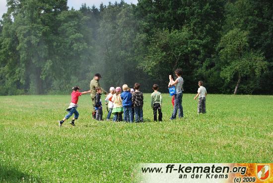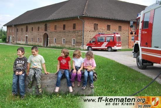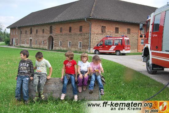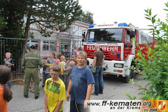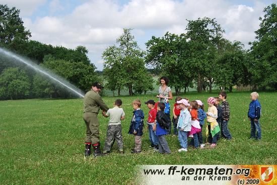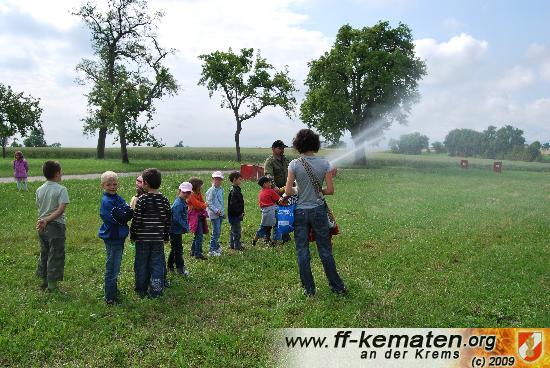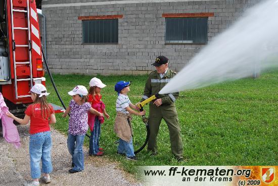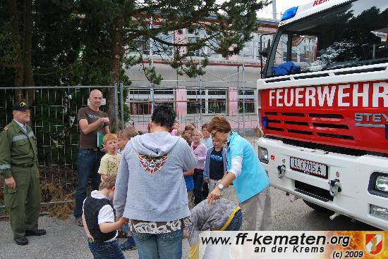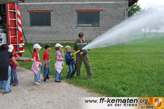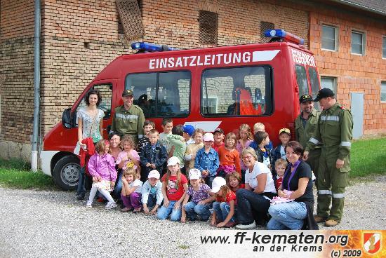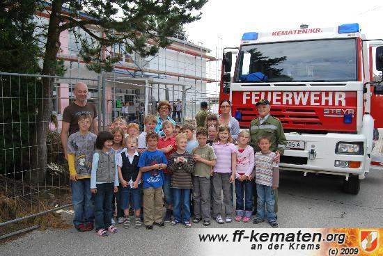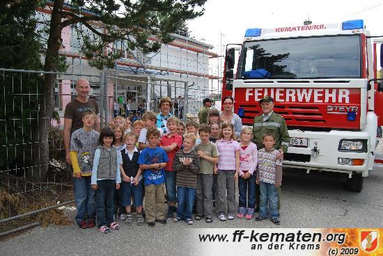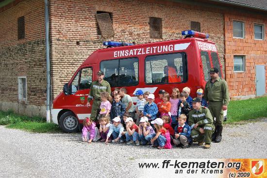 Gerade in der regenreichen Zeit hatte die Gruppe des Kindergarten Kematens Glück und besuchte in einem "Sonnenfenster" die Feuerwehr.