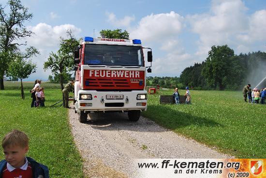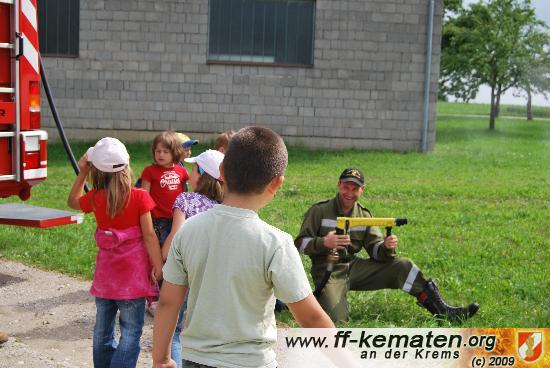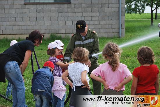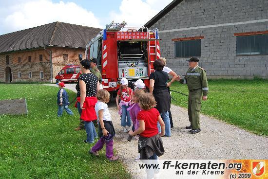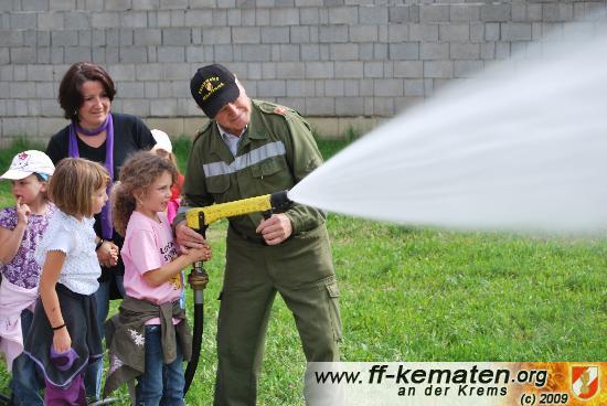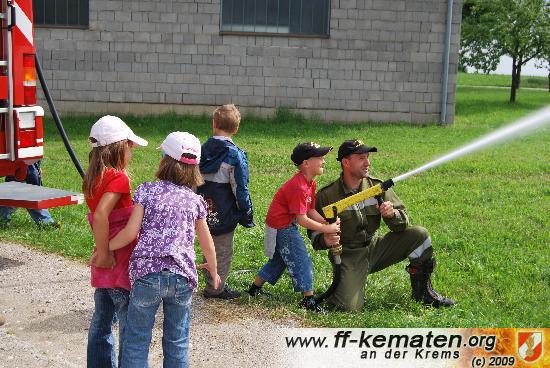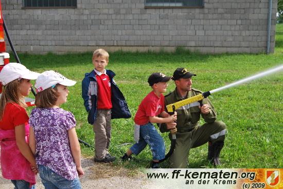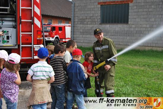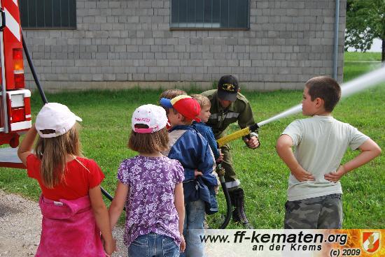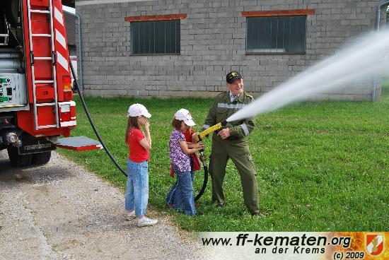 Neben der kindergerechten Vorstellung der Feuerwehr folgte natürlich die obligatorische Fahrt mit den Feuerwehrautos und ein "Spritzen" mit dem HD-Rohr vom TLF-A.