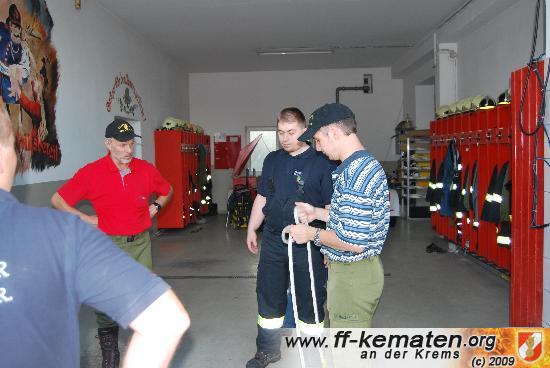 Auch wurde das Anleitern mit der 13m Schiebeleiter geübt. Die Wiederholung der im Feuerwehrdienst gebräuchlichen Knoten bildete den Abschluss der Übung.