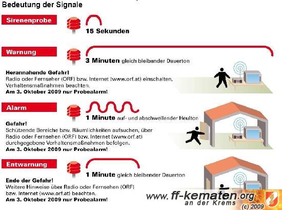 Um Sie mit diesen Signalen vertraut zu machen und gleichzeitig die Funktion und Reichweite der Sirenen zu testen, wird einmal jährlich von der Bundeswarnzentrale im Bundesministerium für Inneres mit den Ämtern der Landesregierungen ein österreichweiter Zivilschutz-Probealarm durchgeführt.