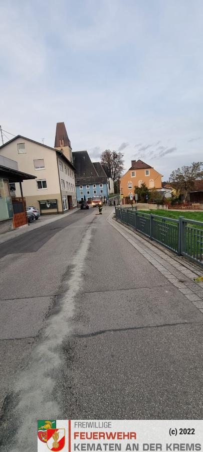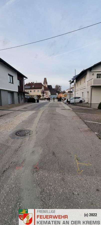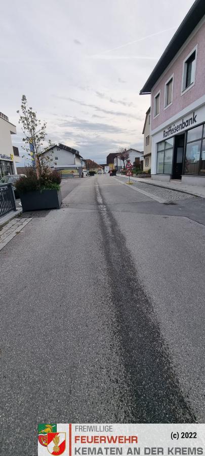 Diese reichte vom Kirchenvorplatz bis nach dem Gemeindeamt. Da es sich um eine aussergewöhnlich große Ölspur, auf einer viel frequentierten Straße handelte, wurde eine hochdurck - Kehrmaschine beordert, um die Straße nach dem ausbringen des Ölbindemittels zu reinigen.