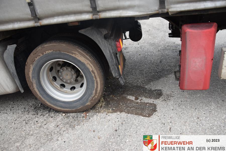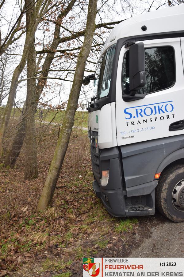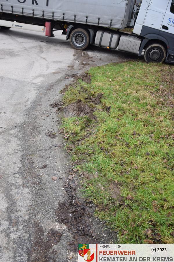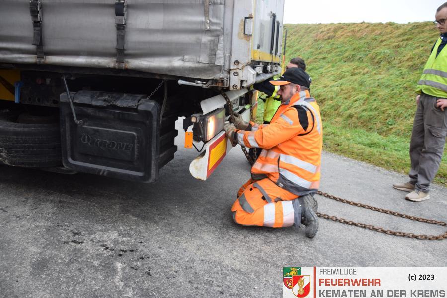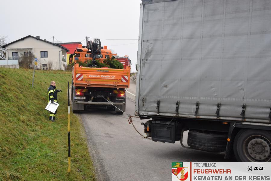 Mithilfe des Gemeinde - LKW konnte der Lastwagen wieder auf die Straße gezogen werden. Nach Reinigung der Fahrbahn konnte der Einsatz nach ca. einer halben Stunde wieder beendet werden.