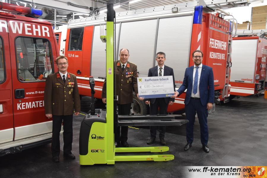 Die Raiffeisenbank Kematen-Neuhofen spendete der FF Kematen/Krems im Zuge des Feuerwehrhaus-Neubaus die Summe von EUR 5.000,00.