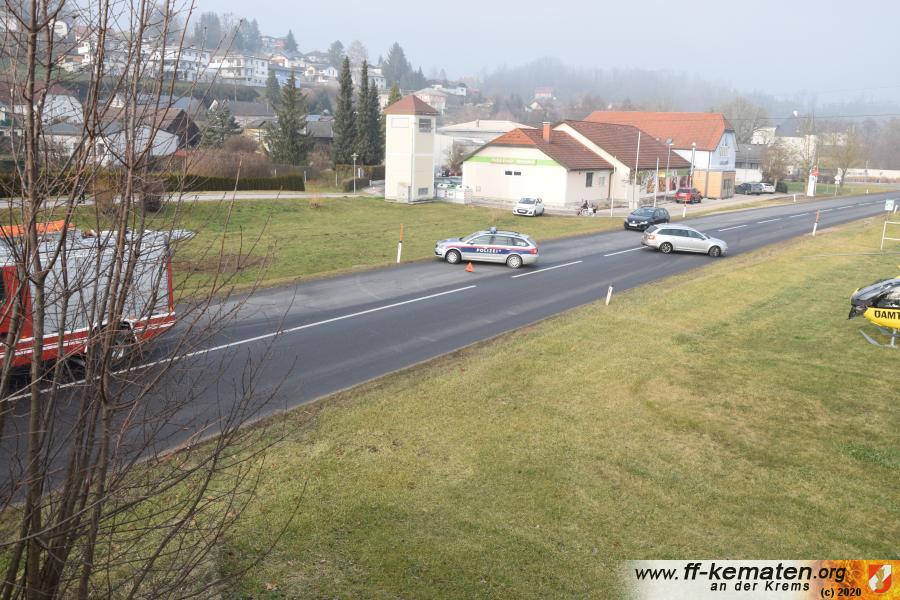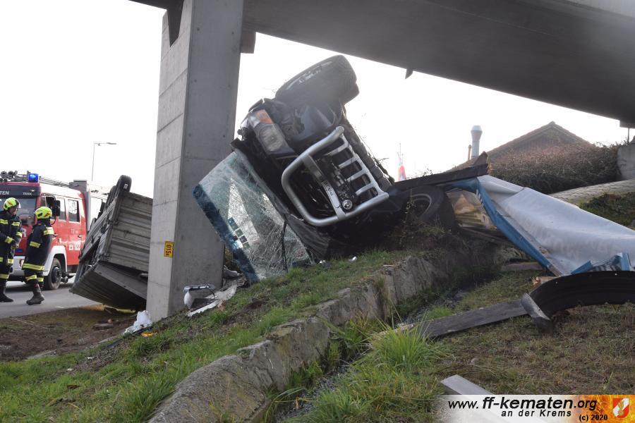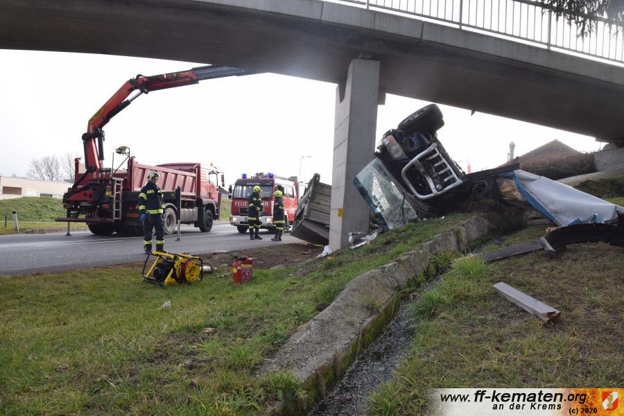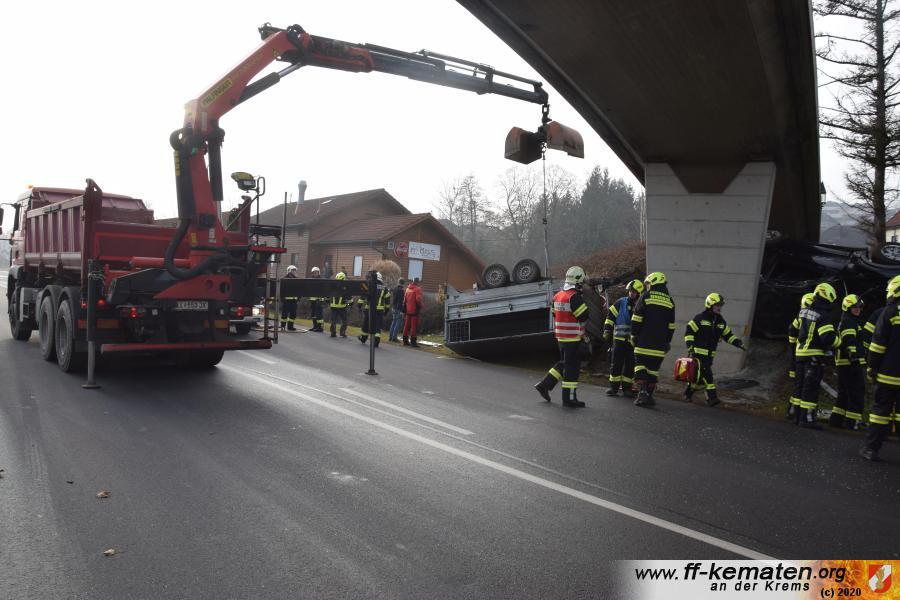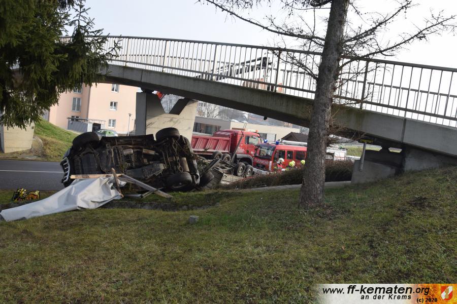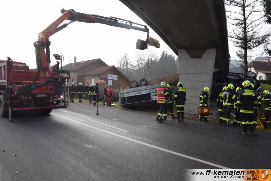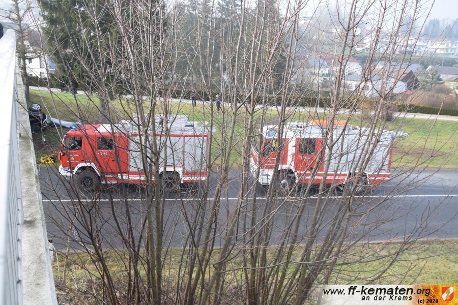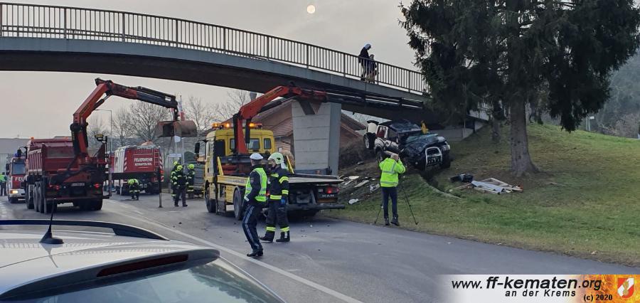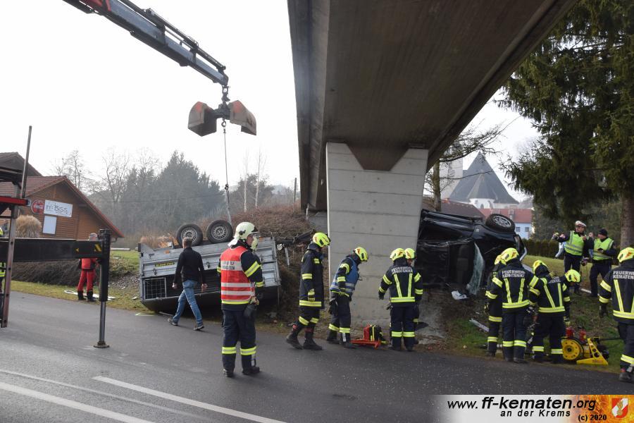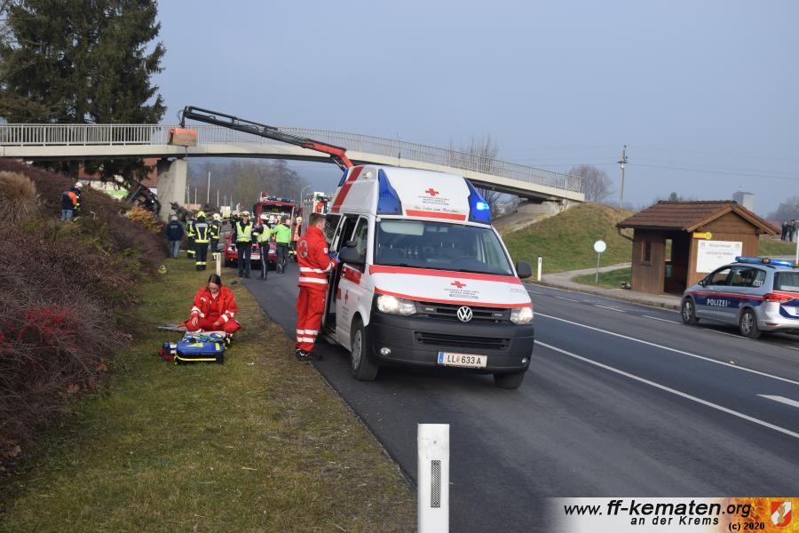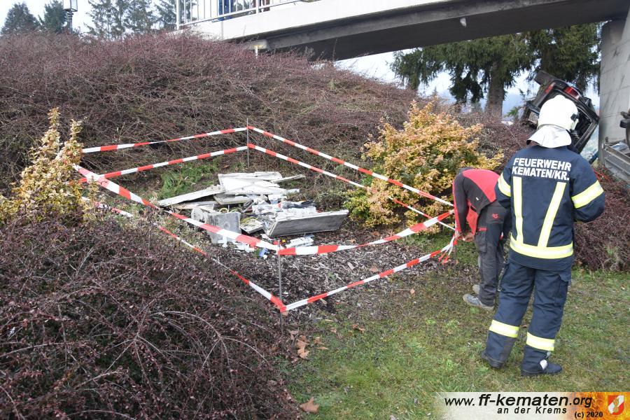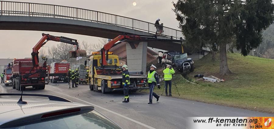 Das Fahrzeug kippte zur Seite und kam anschließend auf der Beifahrerseite, auf einer Böschung neben einem Pfeiler einer Brücke, zum Liegen. Ein entgegenkommendes Fahrzeug konnte gerade noch rechtzeitig ausweichen. Die Einsatzkräfte, von den Feuerwehren Kematen an der Krems und Achleiten sowie dem Roten Kreuz samt Notarzt, mussten eine Person mit dem hydraulischen Rettungsgerät aus dem Geländewagen befreien. Nach Erstversorgung wurde die Person mit Verletzungen unbestimmten Grades mit dem Rettungshubschrauber in ein Krankenhaus geflogen. Die B139 musste während der Rettungs- und Aufräumarbeiten komplett gesperrt werden. Laut ersten Informationen könnte die Ursache des Unfalls auf gesundheitliche Probleme zurückzuführen sein. Durch den zerstörten Verteilerkasten kam es in einer Einrichtung für betreutes Wohnen sowie in einem Imbissstand zu einem Stromausfall. Der Energieversorger war bereits nach kurzer Zeit vor Ort um den Schaden zu beheben.