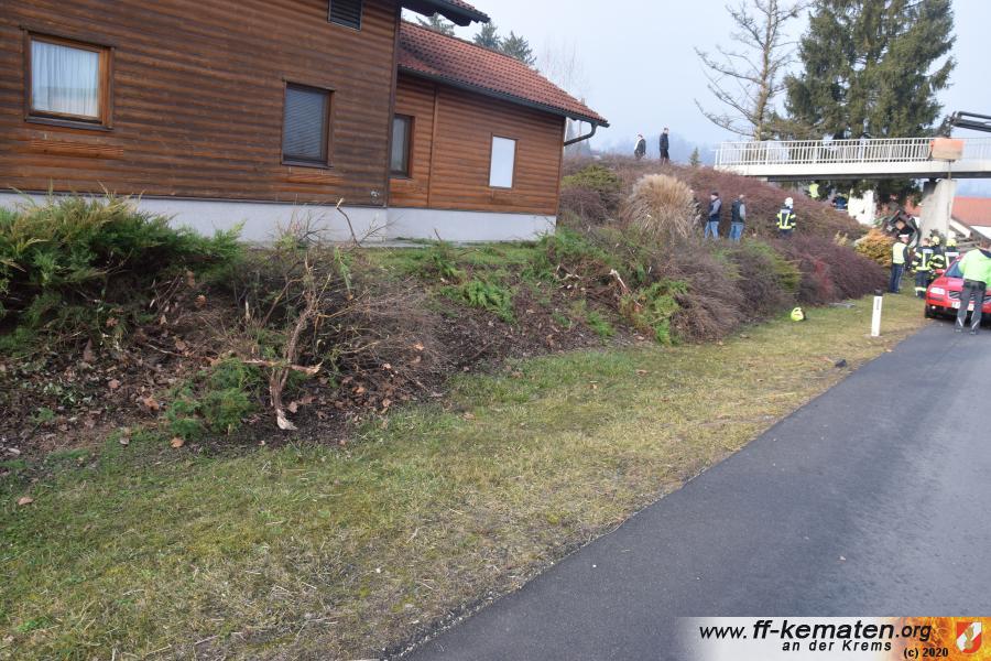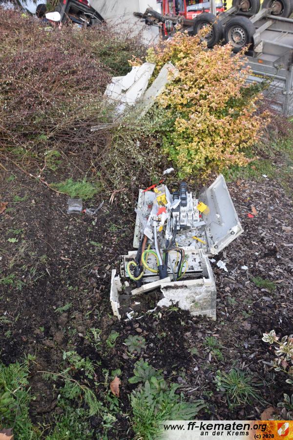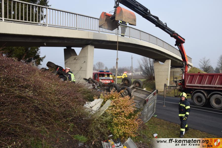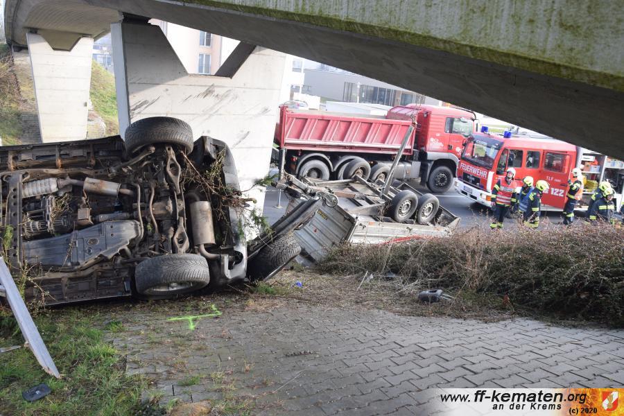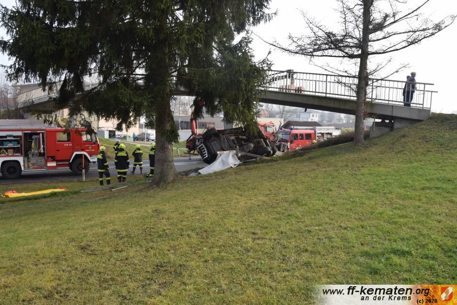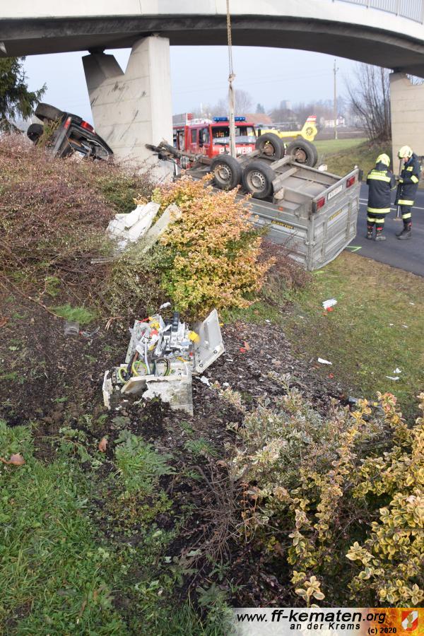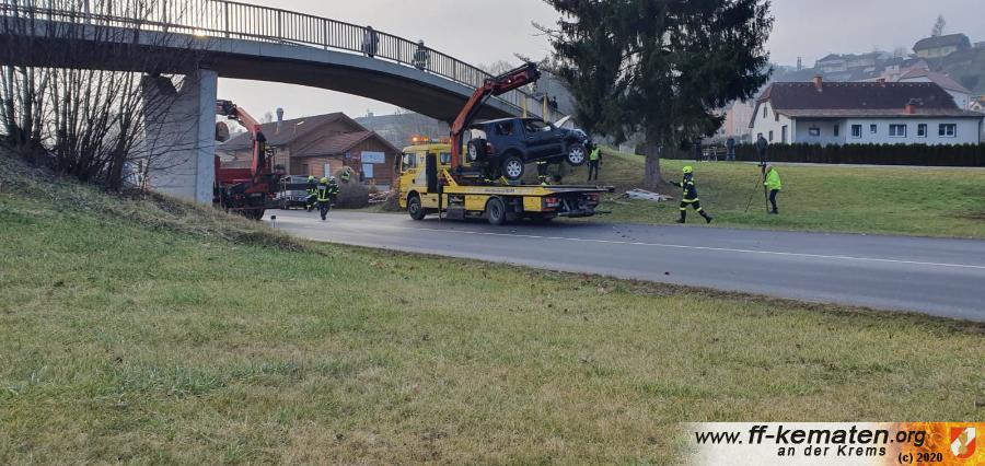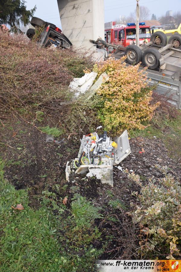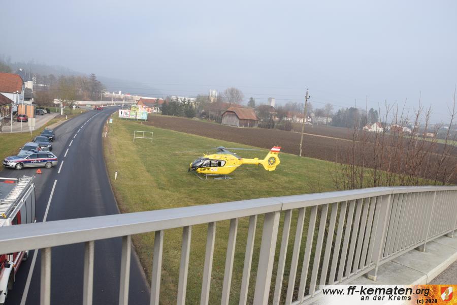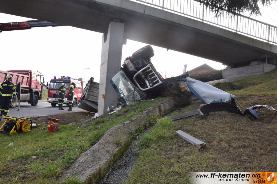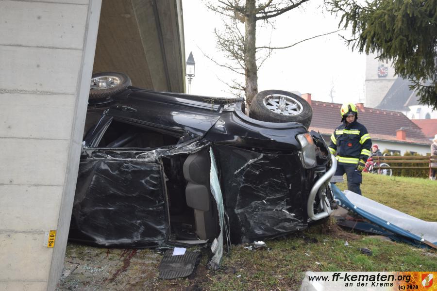 Das Fahrzeug kippte zur Seite und kam anschließend auf der Beifahrerseite, auf einer Böschung neben einem Pfeiler einer Brücke, zum Liegen. Ein entgegenkommendes Fahrzeug konnte gerade noch rechtzeitig ausweichen. Die Einsatzkräfte, von den Feuerwehren Kematen an der Krems und Achleiten sowie dem Roten Kreuz samt Notarzt, mussten eine Person mit dem hydraulischen Rettungsgerät aus dem Geländewagen befreien. Nach Erstversorgung wurde die Person mit Verletzungen unbestimmten Grades mit dem Rettungshubschrauber in ein Krankenhaus geflogen. Die B139 musste während der Rettungs- und Aufräumarbeiten komplett gesperrt werden. Laut ersten Informationen könnte die Ursache des Unfalls auf gesundheitliche Probleme zurückzuführen sein. Durch den zerstörten Verteilerkasten kam es in einer Einrichtung für betreutes Wohnen sowie in einem Imbissstand zu einem Stromausfall. Der Energieversorger war bereits nach kurzer Zeit vor Ort um den Schaden zu beheben.