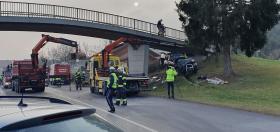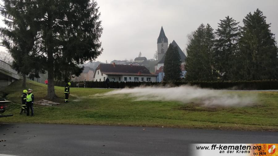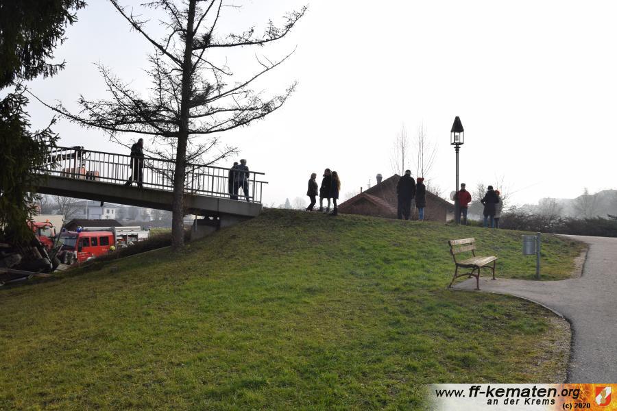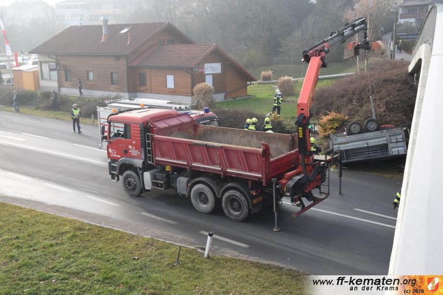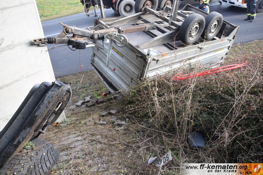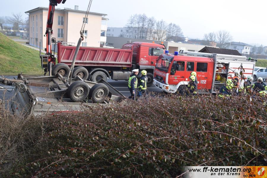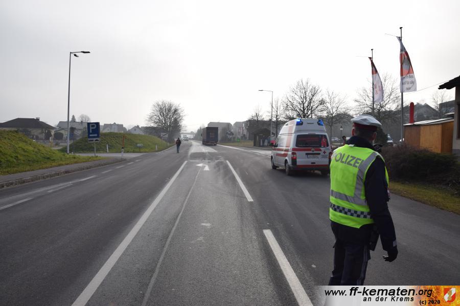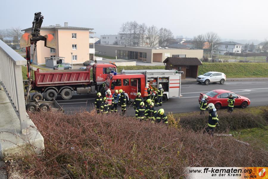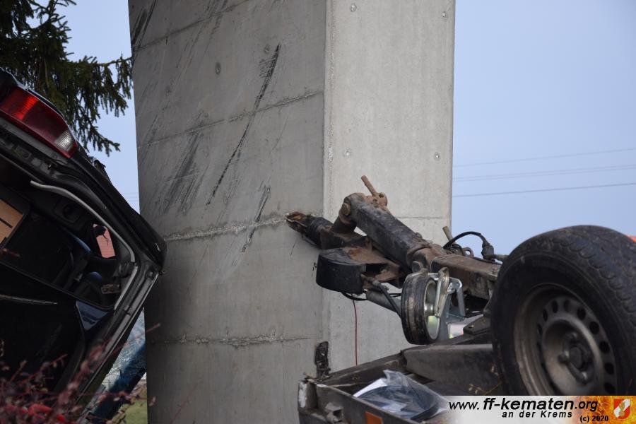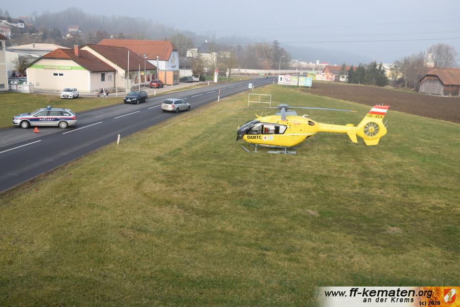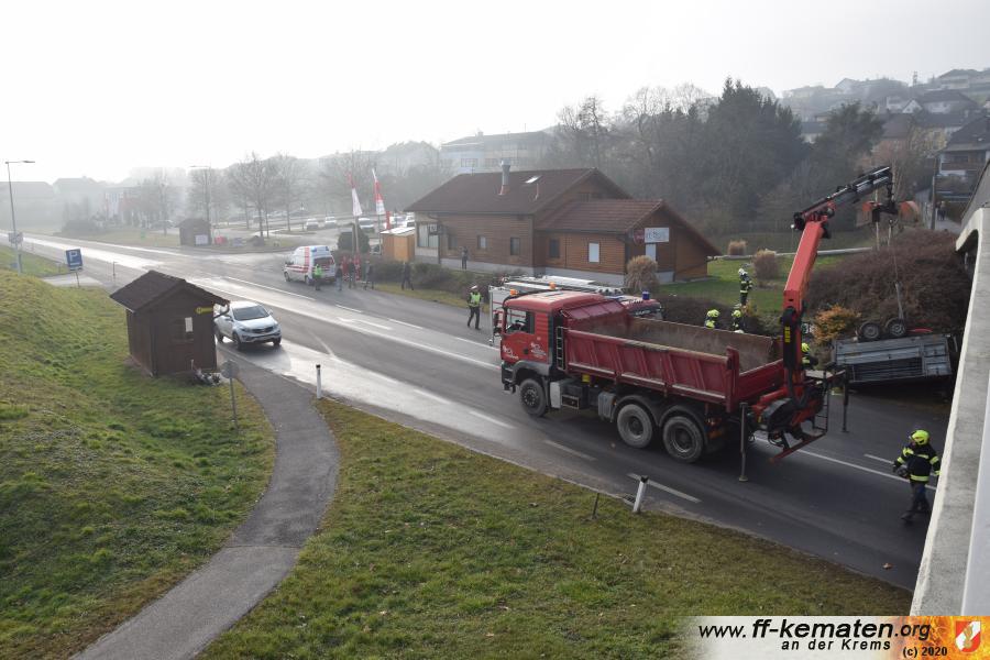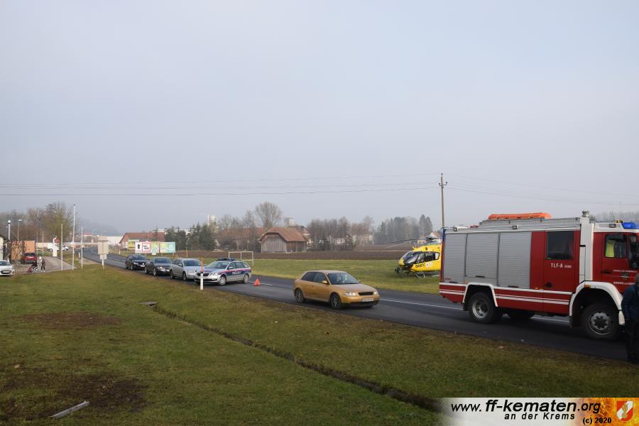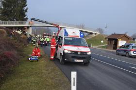 Das Fahrzeug kippte zur Seite und kam anschließend auf der Beifahrerseite, auf einer Böschung neben einem Pfeiler einer Brücke, zum Liegen. Ein entgegenkommendes Fahrzeug konnte gerade noch rechtzeitig ausweichen. Die Einsatzkräfte, von den Feuerwehren Kematen an der Krems und Achleiten sowie dem Roten Kreuz samt Notarzt, mussten eine Person mit dem hydraulischen Rettungsgerät aus dem Geländewagen befreien. Nach Erstversorgung wurde die Person mit Verletzungen unbestimmten Grades mit dem Rettungshubschrauber in ein Krankenhaus geflogen. Die B139 musste während der Rettungs- und Aufräumarbeiten komplett gesperrt werden. Laut ersten Informationen könnte die Ursache des Unfalls auf gesundheitliche Probleme zurückzuführen sein. Durch den zerstörten Verteilerkasten kam es in einer Einrichtung für betreutes Wohnen sowie in einem Imbissstand zu einem Stromausfall. Der Energieversorger war bereits nach kurzer Zeit vor Ort um den Schaden zu beheben.