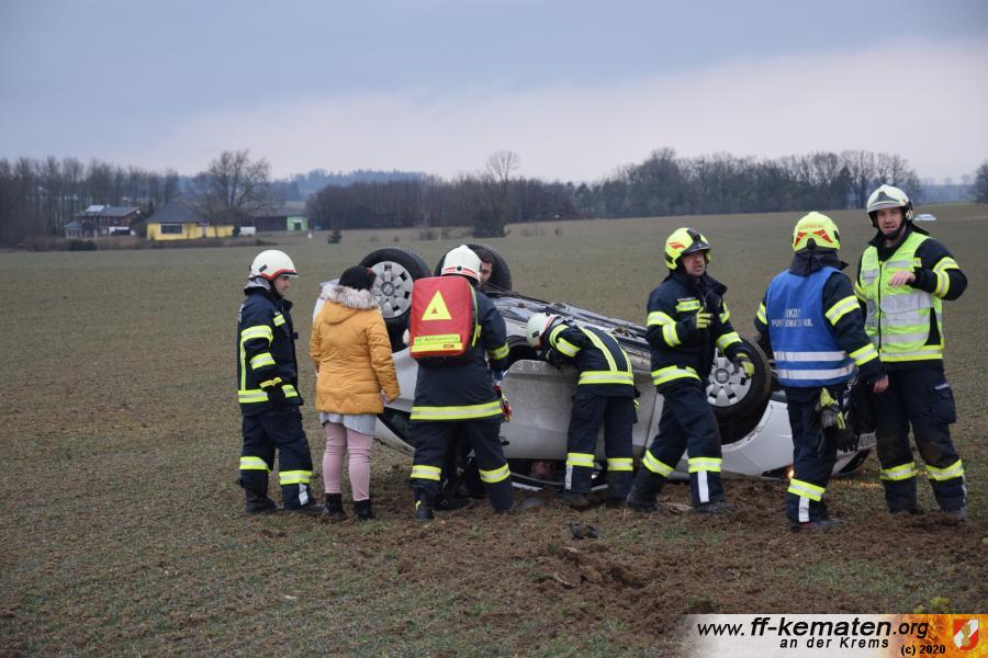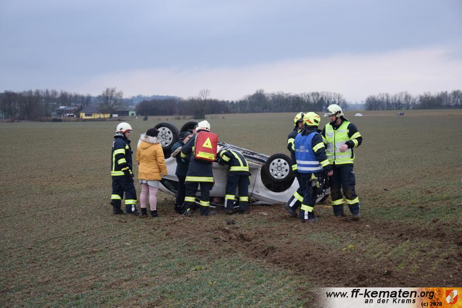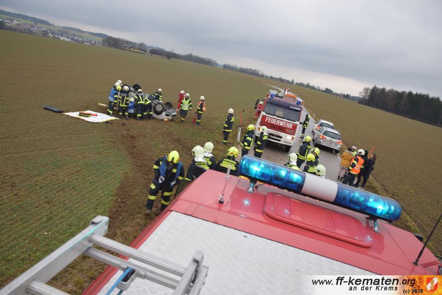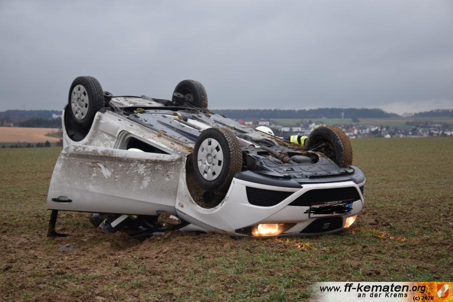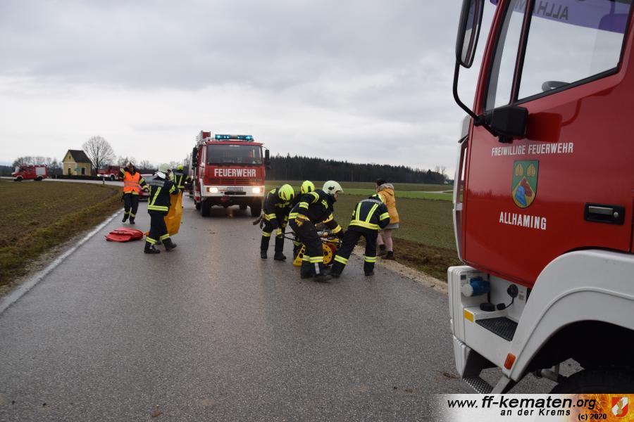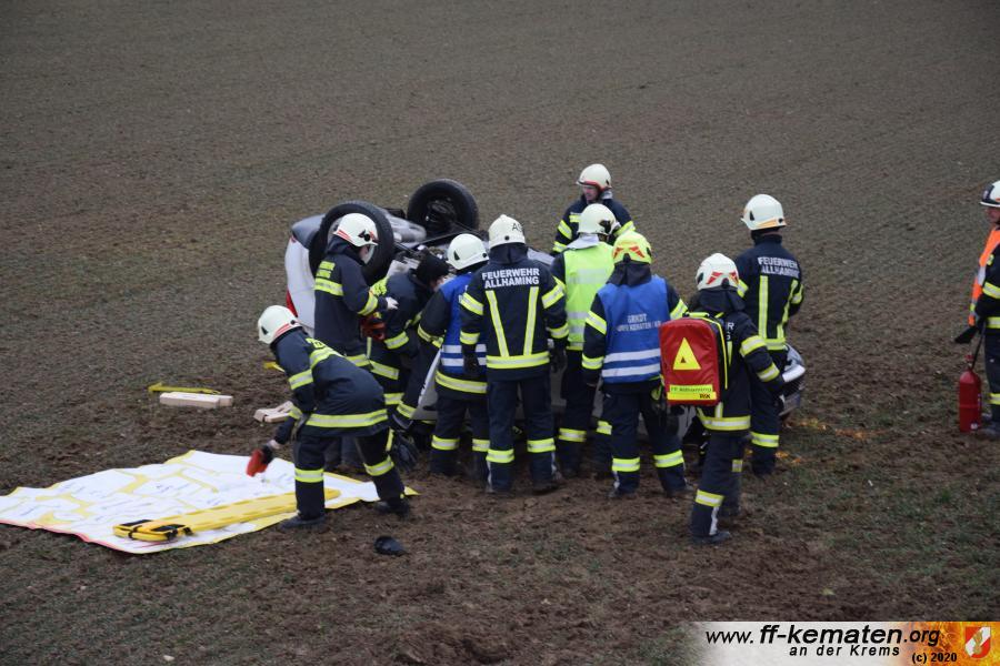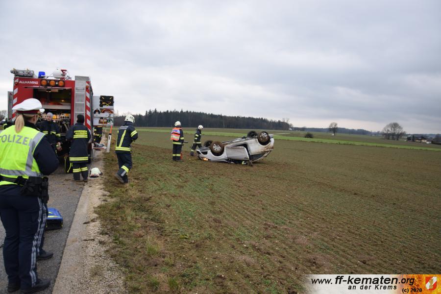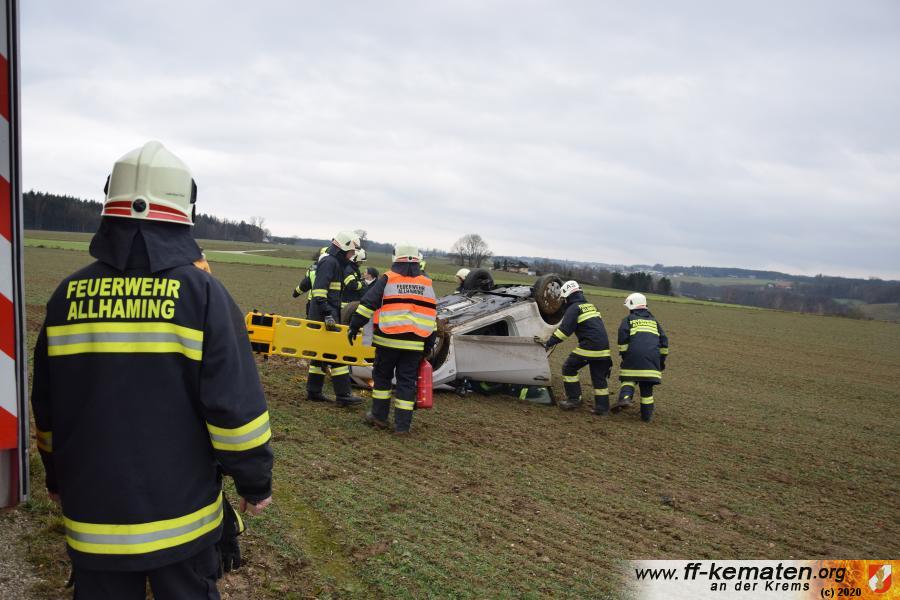 Der Unfall ereignete sich auf der Gerersdorfer Straße im Gemeindegebiet von Allhaming. Aus bisher unbekannter Ursache kam ein PKW von der Fahrbahn ab und überschlug sich in ein angrenzendes Feld, wo das Auto auf dem Dach liegend zum Stillstand kam. Entgegen ersten Befürchtungen war zum Glück niemand im Fahrzeug eingeklemmt, sondern nur eine Person am Anfang im Unfallfahrzeug eingeschlossen. Die Person wurde von Rettungsdienst und Notarzt erstversorgt. Die Feuerwehr sicherte die Unfallstelle ab und unterstützte den Abschleppdienst bei der Bergung des verunfallten Autos.