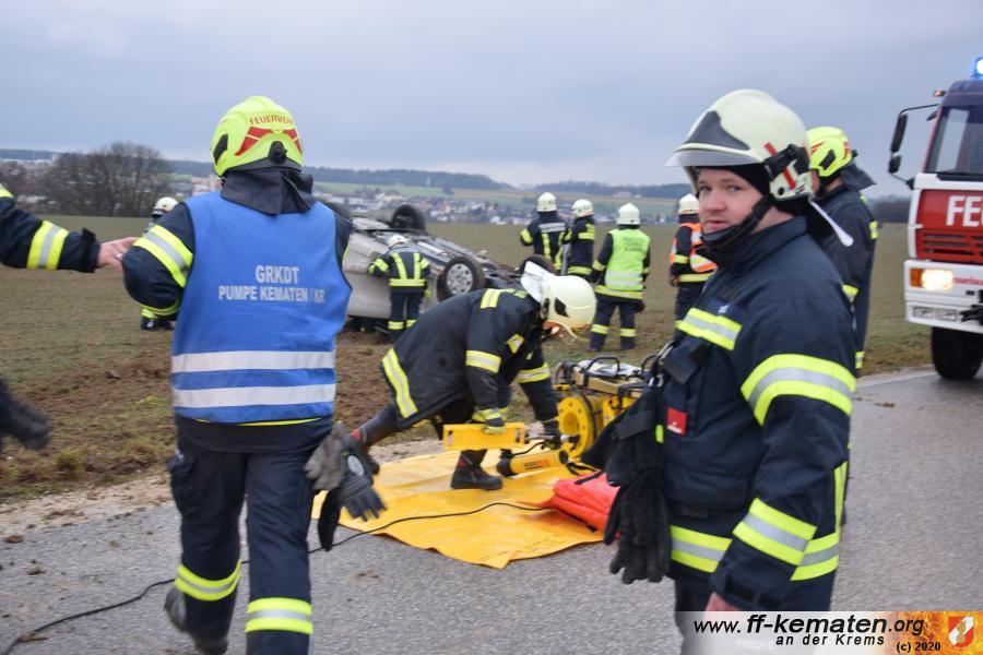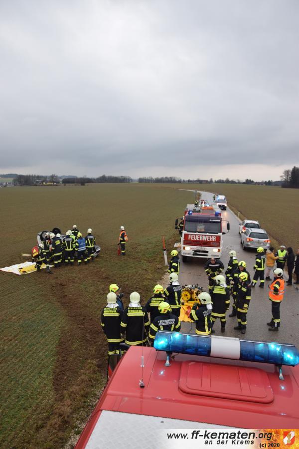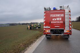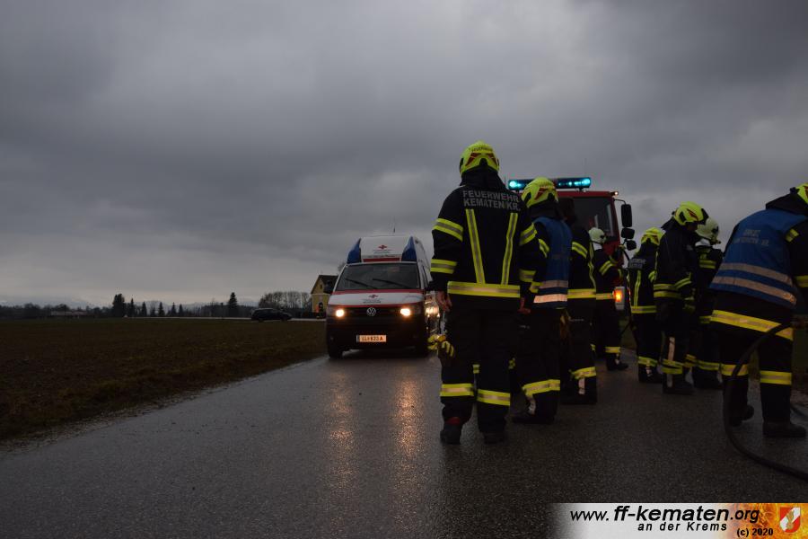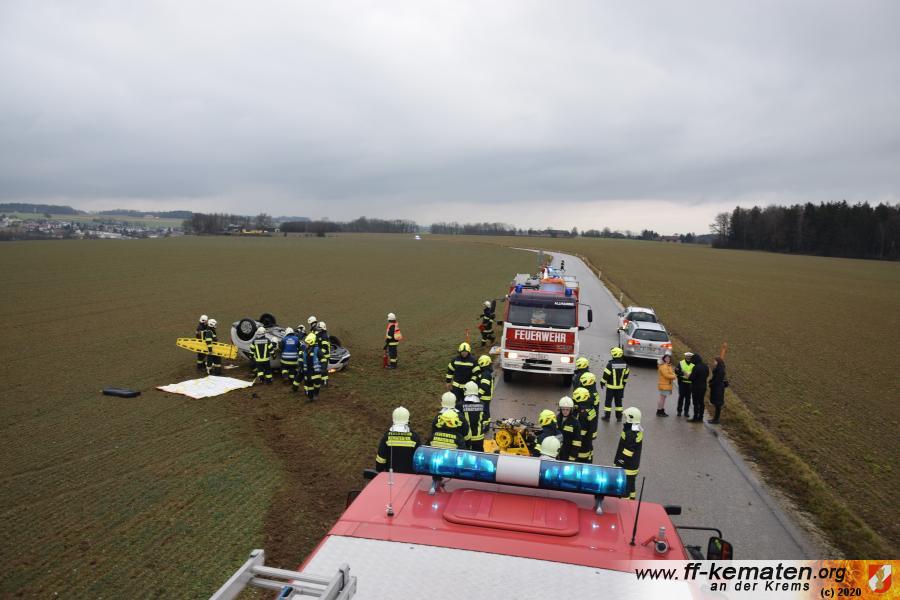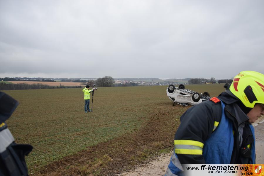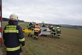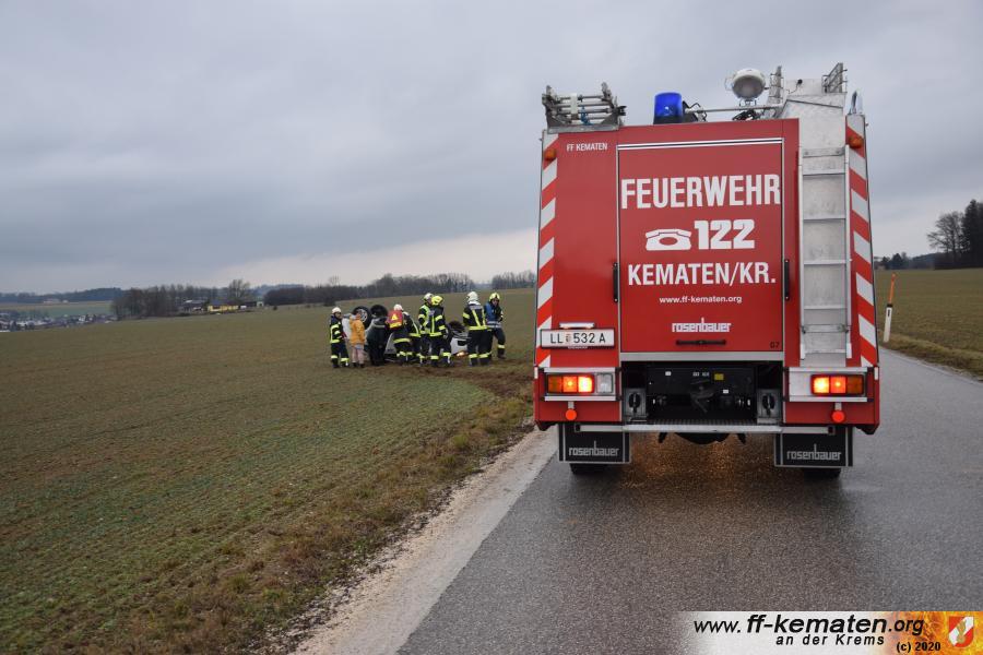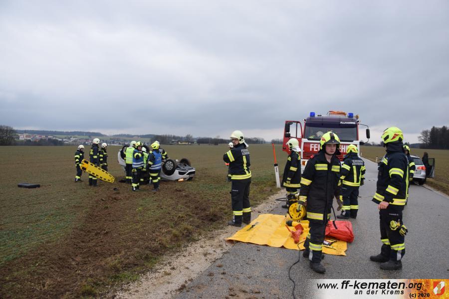 Der Unfall ereignete sich auf der Gerersdorfer Straße im Gemeindegebiet von Allhaming. Aus bisher unbekannter Ursache kam ein PKW von der Fahrbahn ab und überschlug sich in ein angrenzendes Feld, wo das Auto auf dem Dach liegend zum Stillstand kam. Entgegen ersten Befürchtungen war zum Glück niemand im Fahrzeug eingeklemmt, sondern nur eine Person am Anfang im Unfallfahrzeug eingeschlossen. Die Person wurde von Rettungsdienst und Notarzt erstversorgt. Die Feuerwehr sicherte die Unfallstelle ab und unterstützte den Abschleppdienst bei der Bergung des verunfallten Autos.