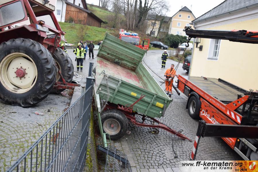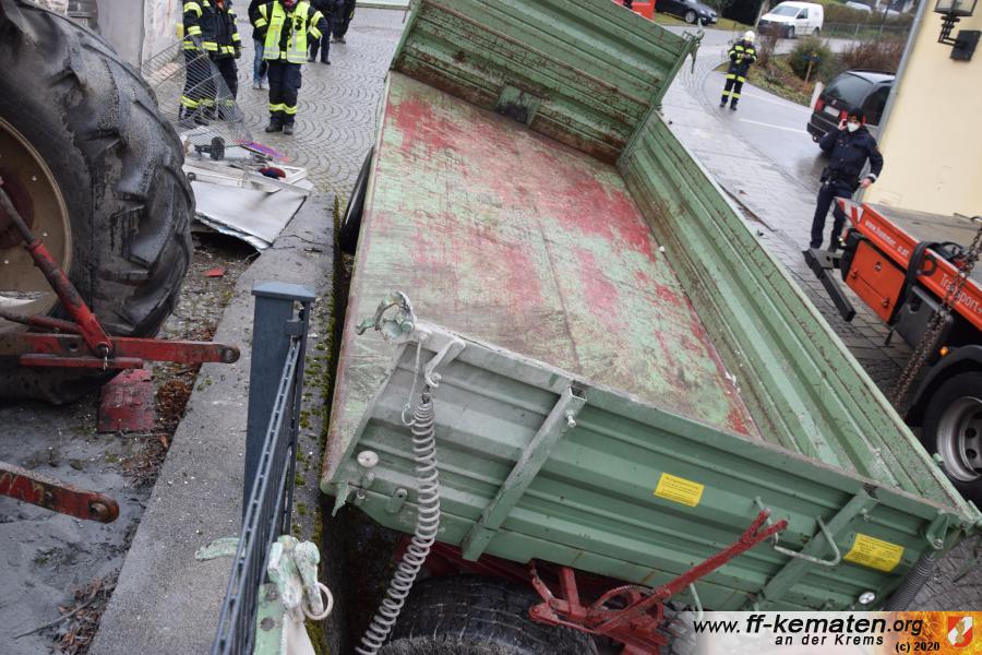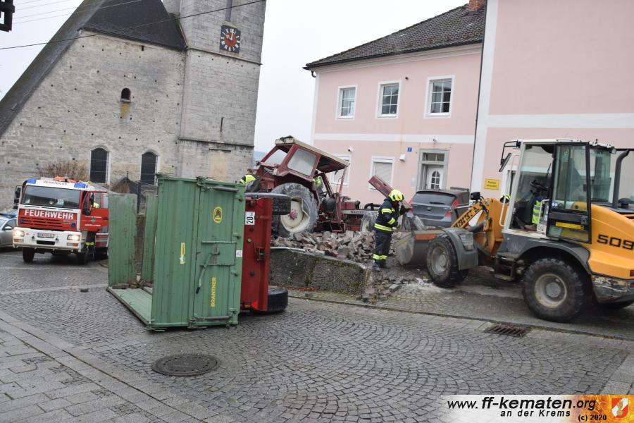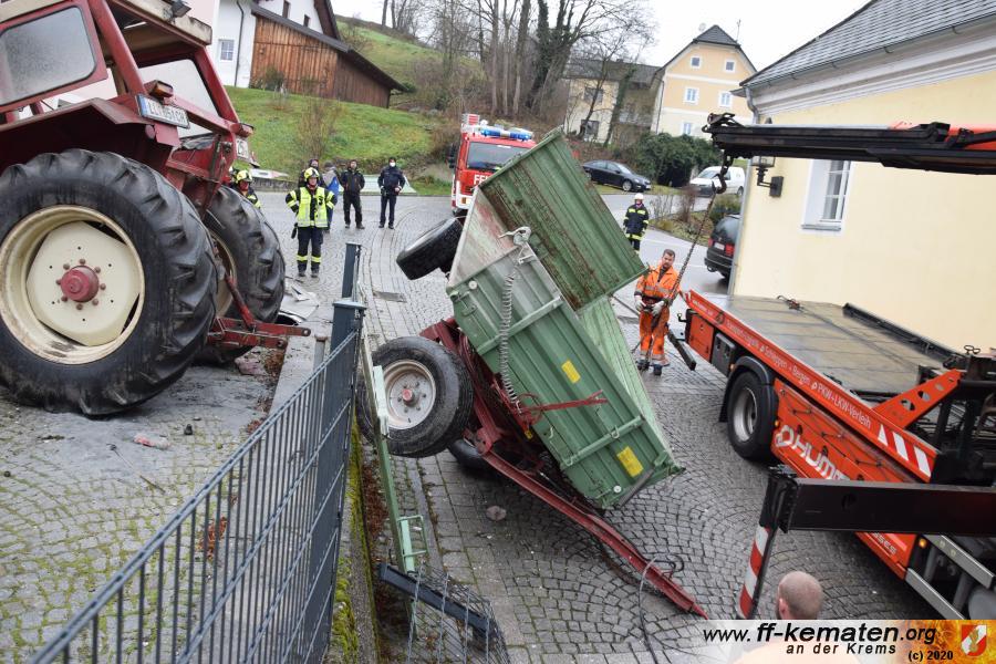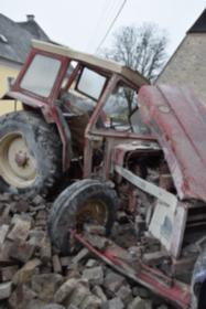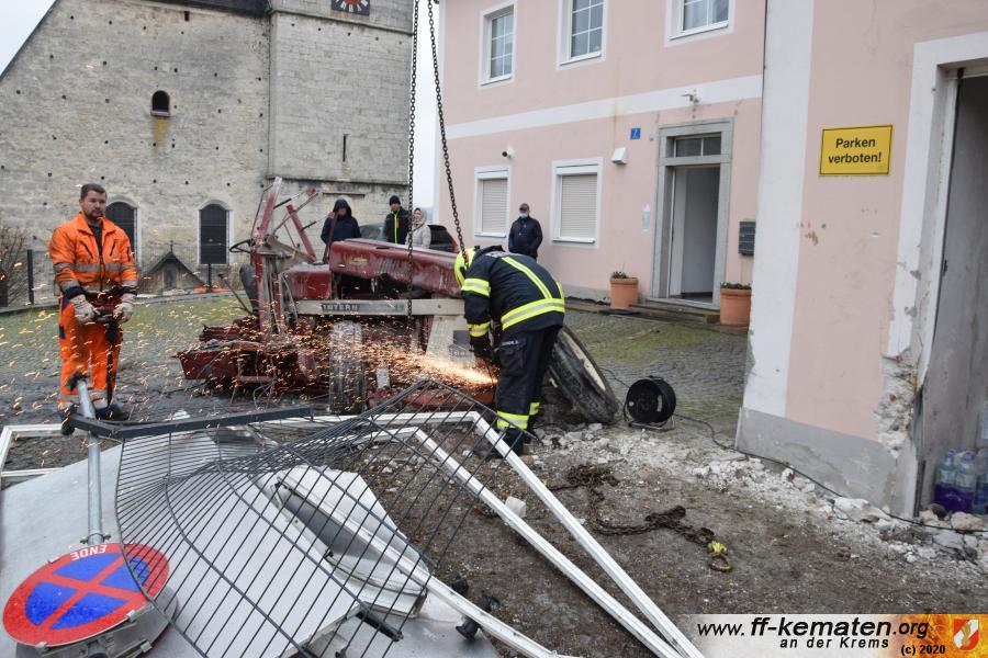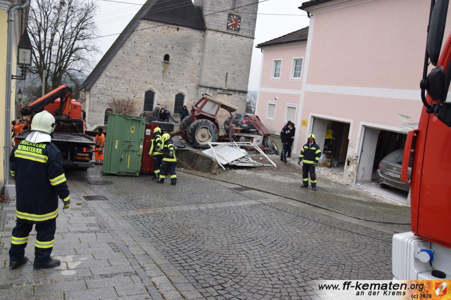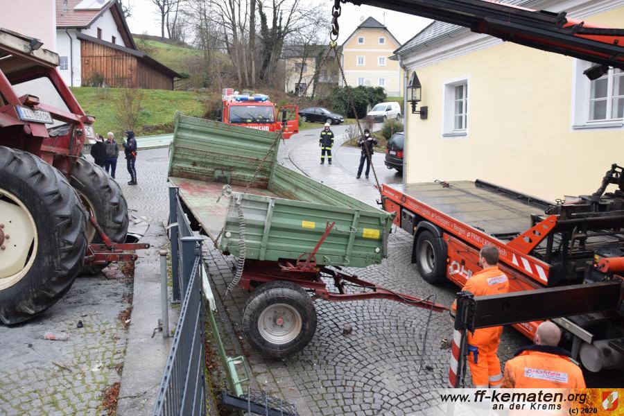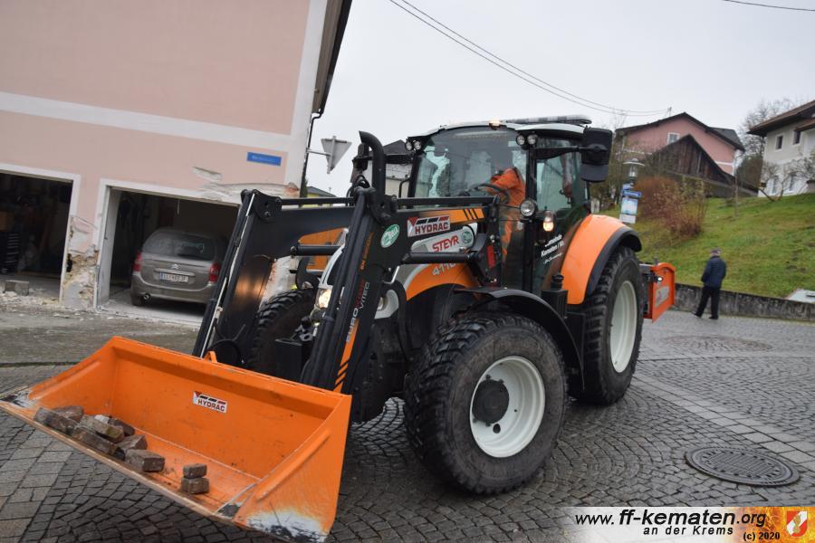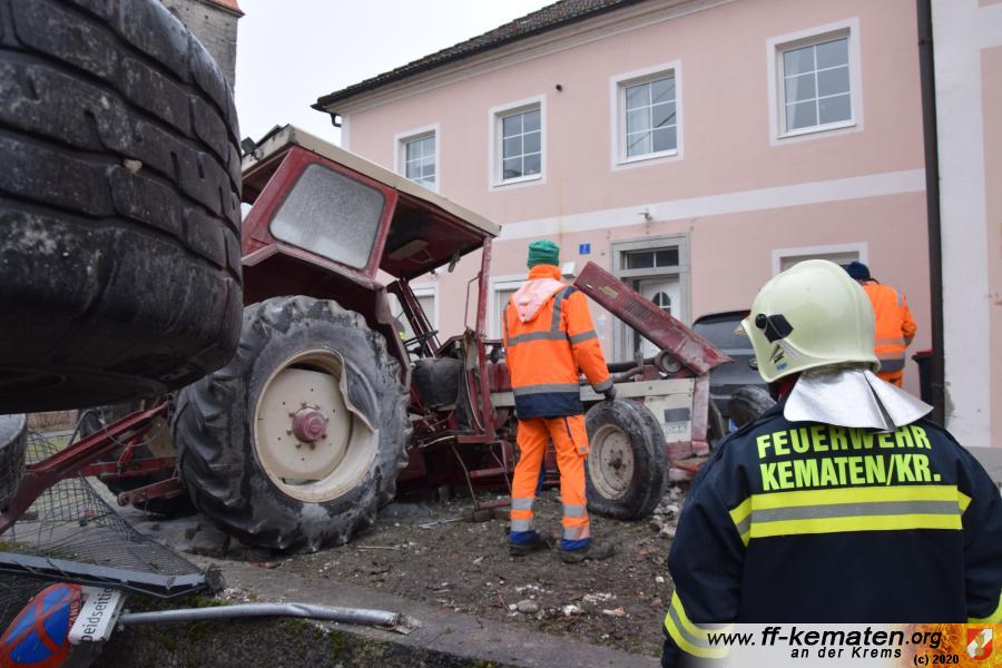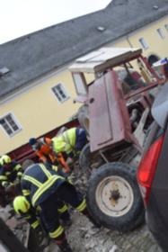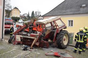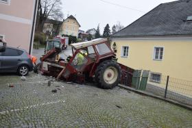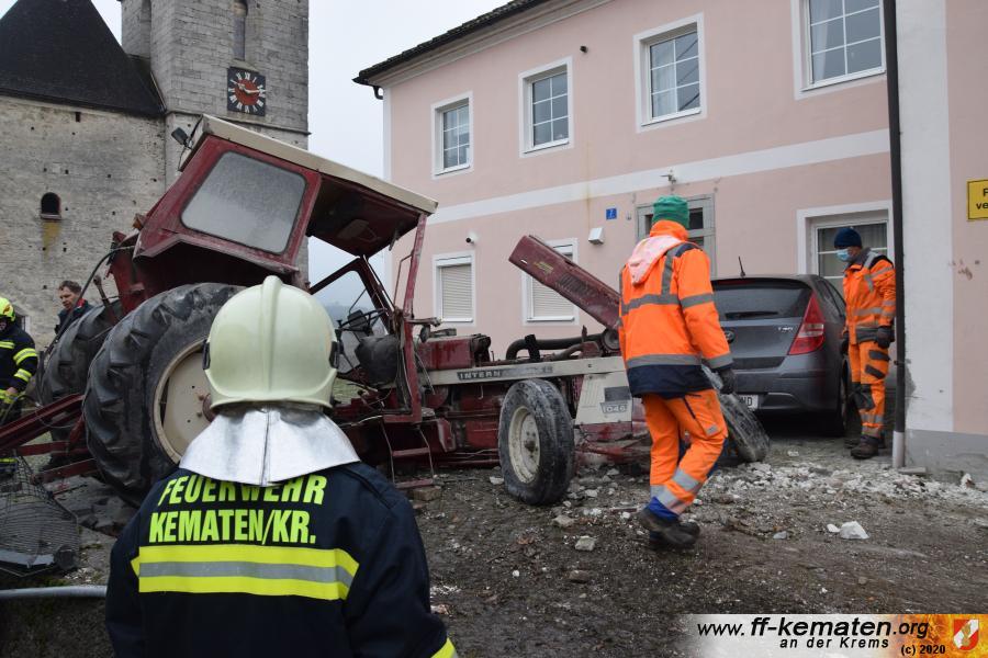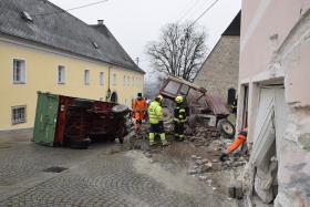 Ein Traktorgespann geriet in der Römerstraße außer Kontrolle und kollidierte am Kirchenplatz mit einem Gebäude.