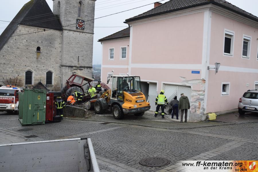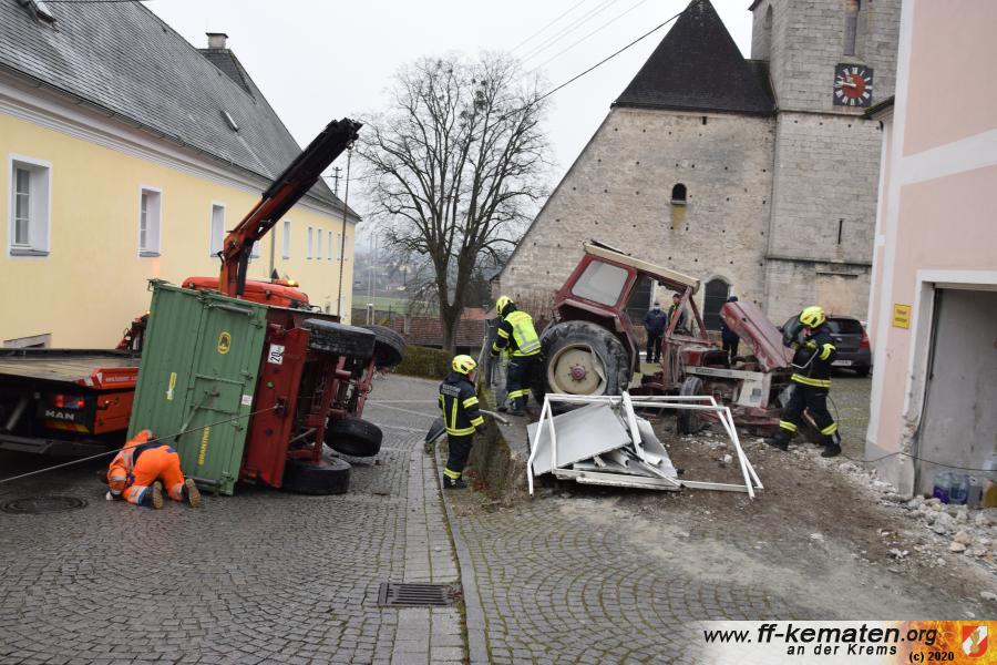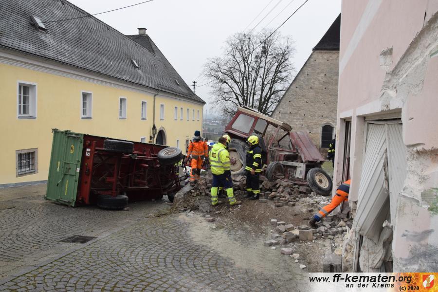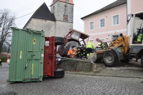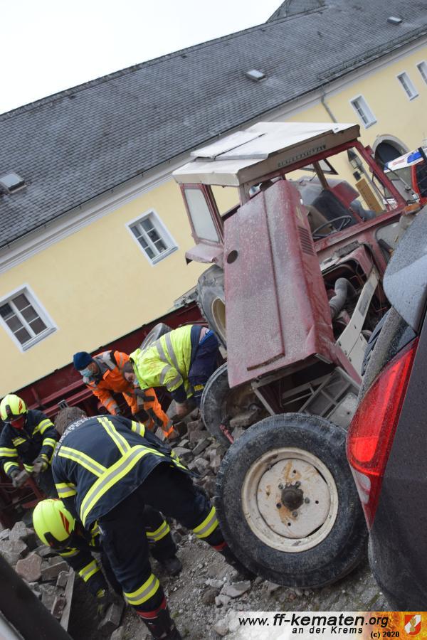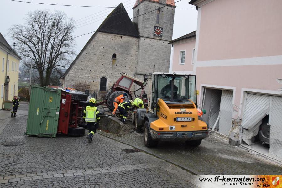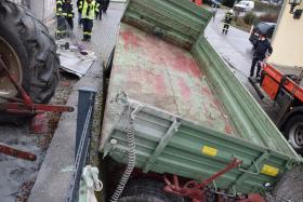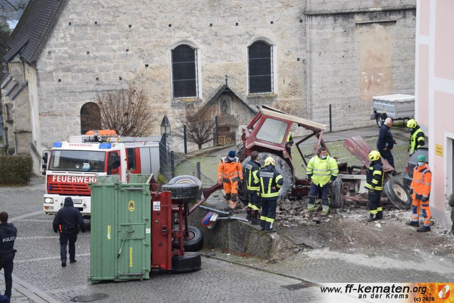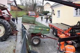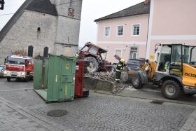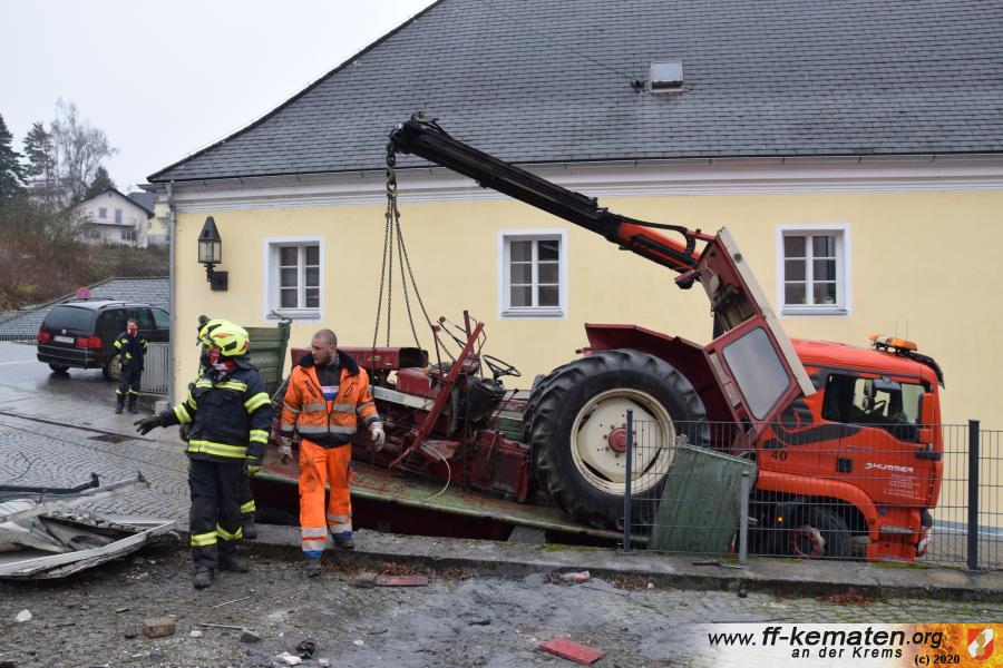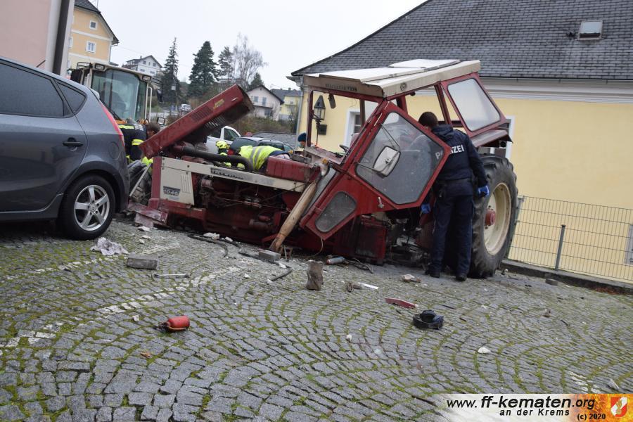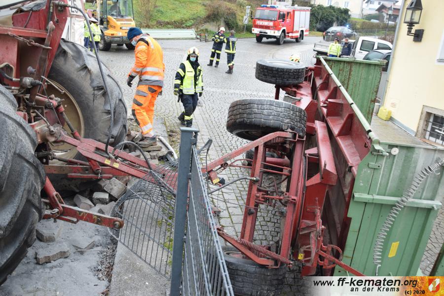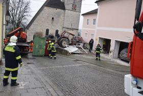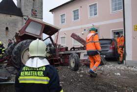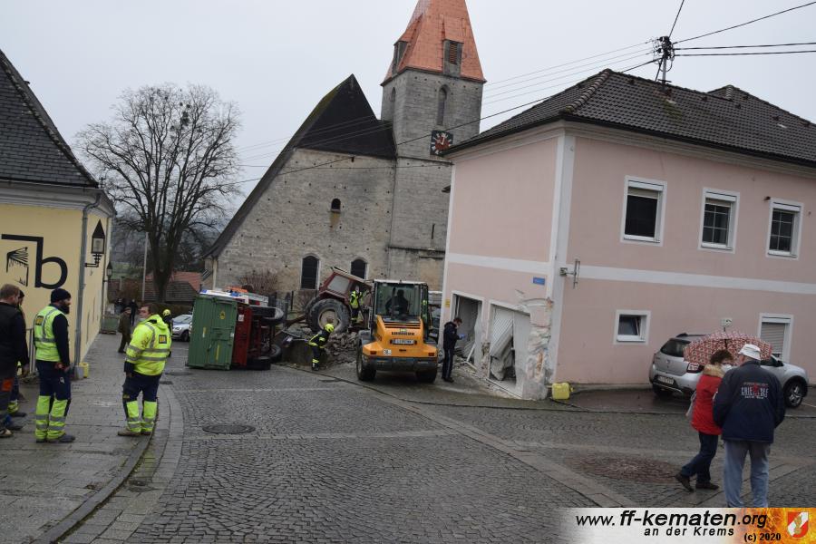 Ein Traktorgespann geriet in der Römerstraße außer Kontrolle und kollidierte am Kirchenplatz mit einem Gebäude.