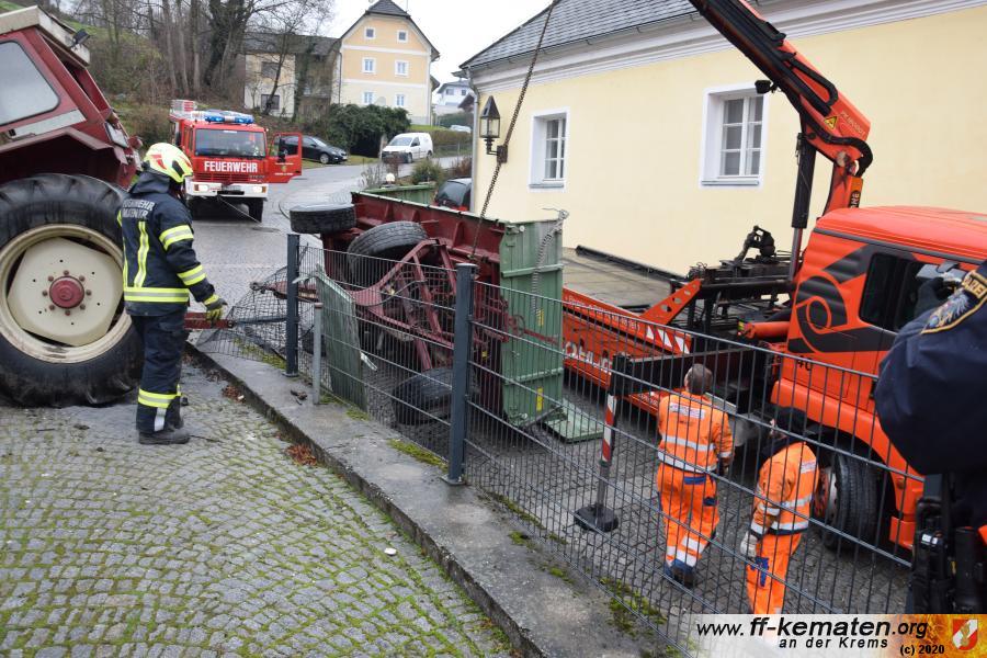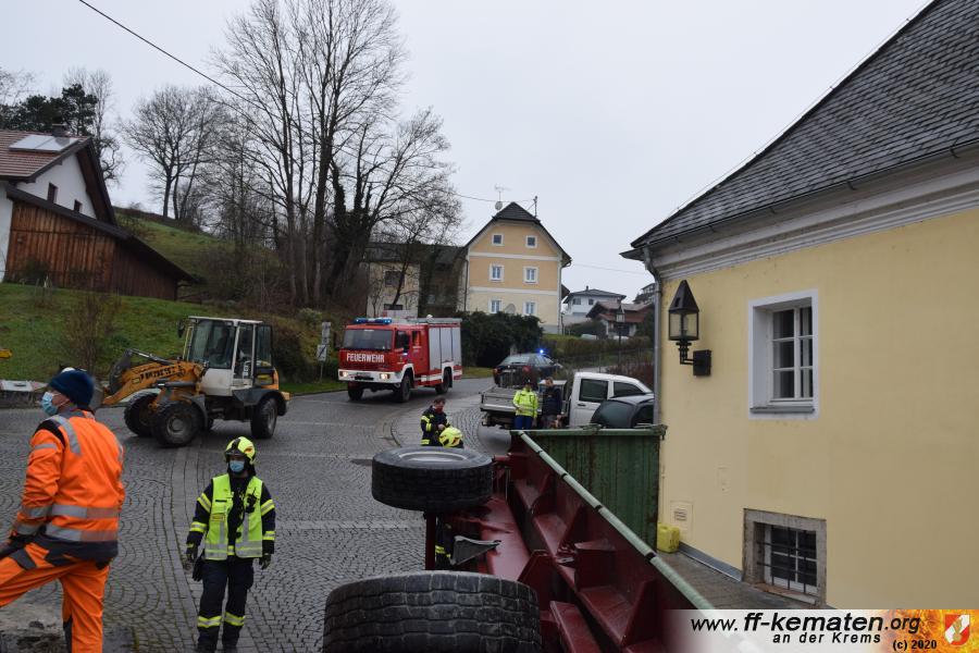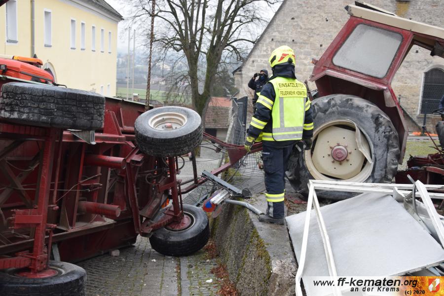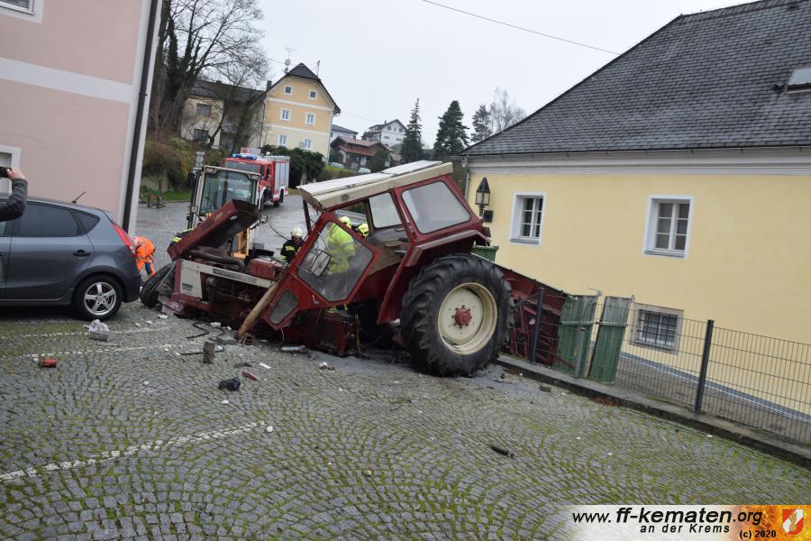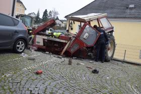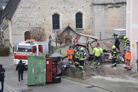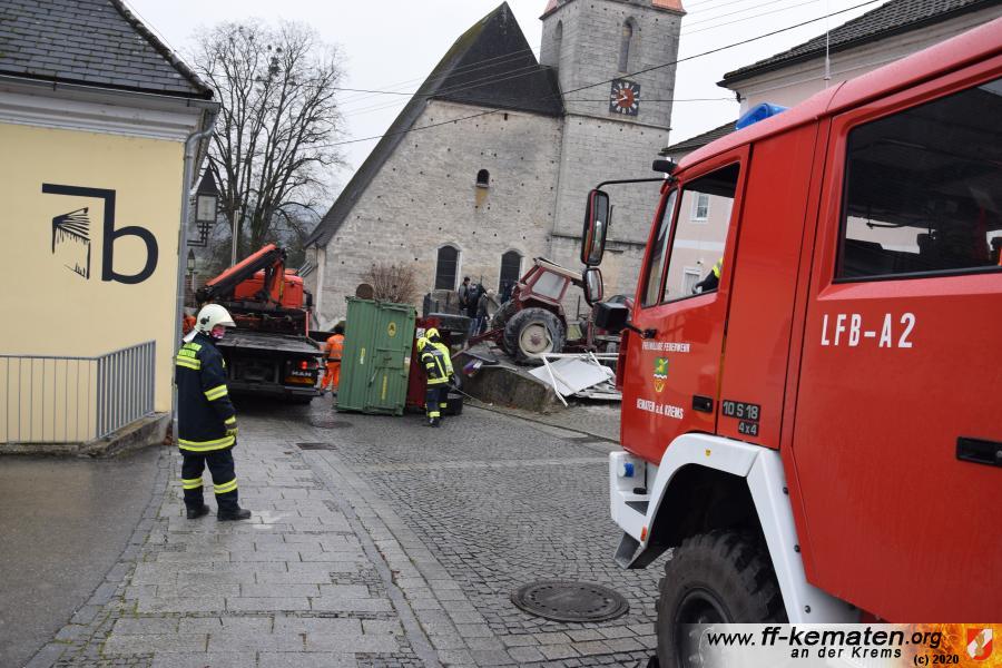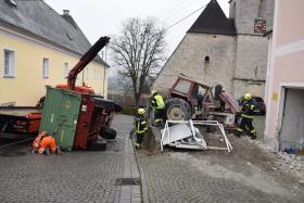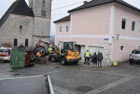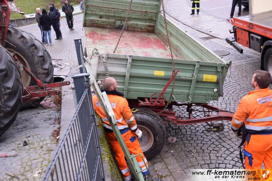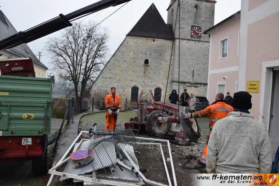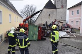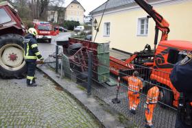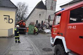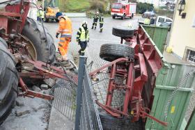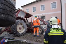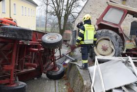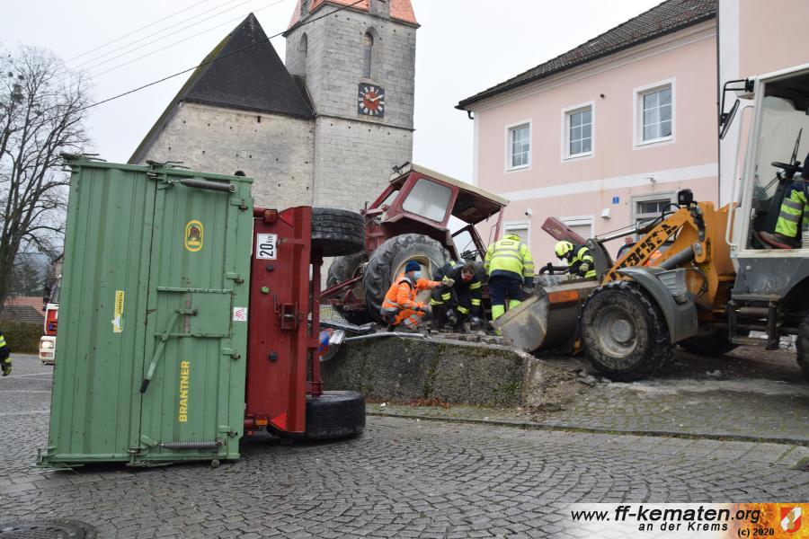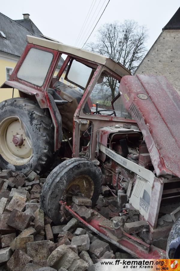 Ein Traktorgespann geriet in der Römerstraße außer Kontrolle und kollidierte am Kirchenplatz mit einem Gebäude.