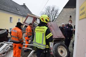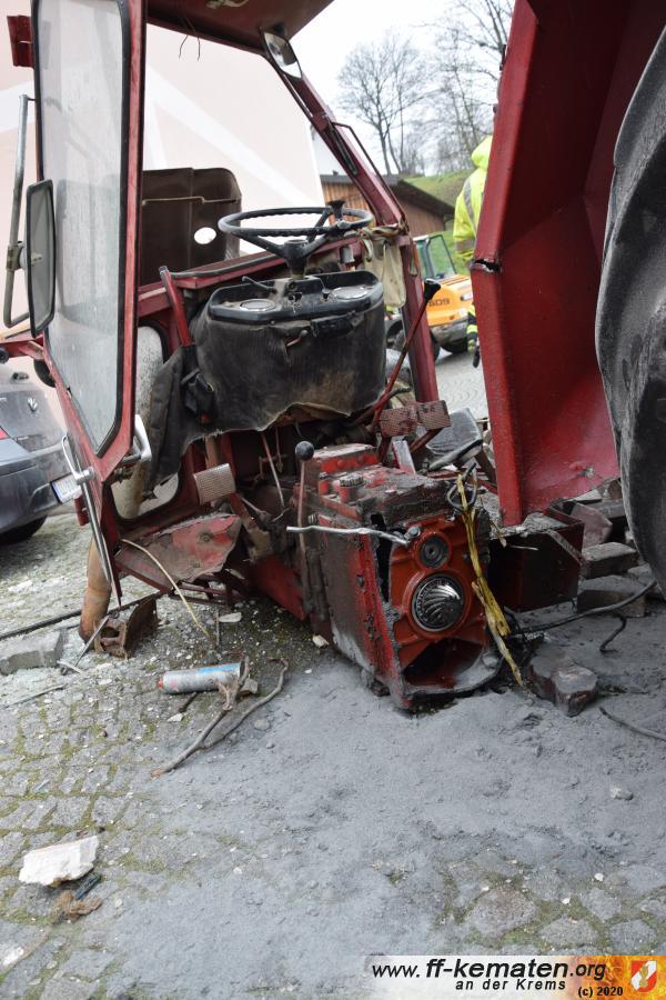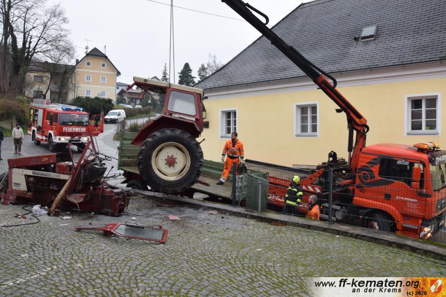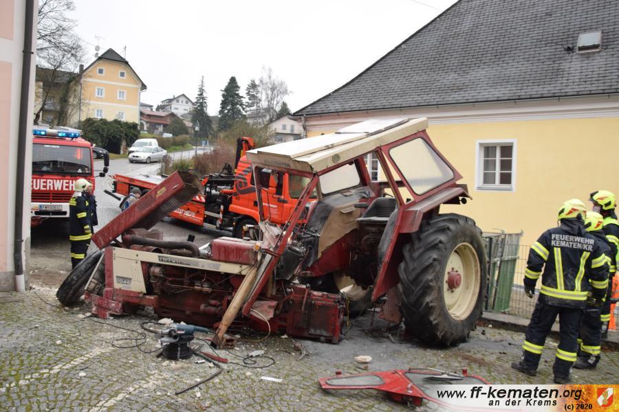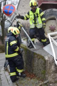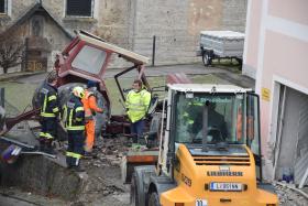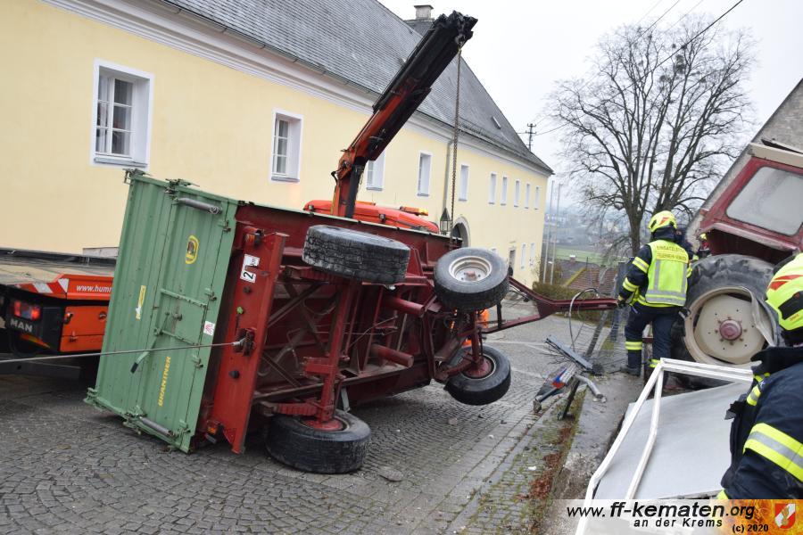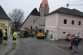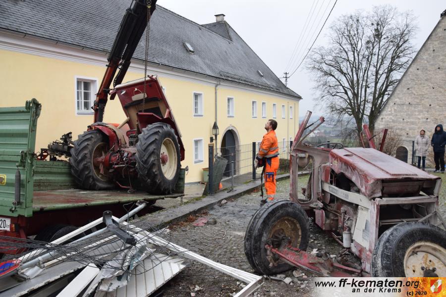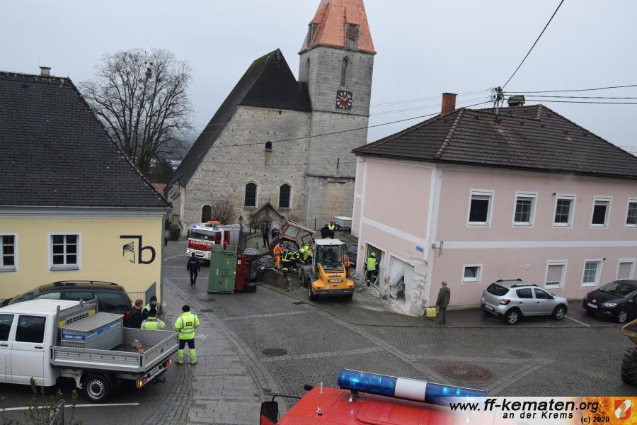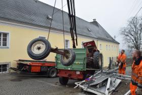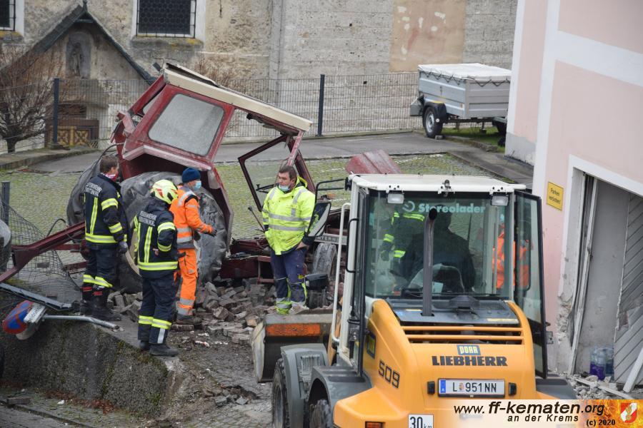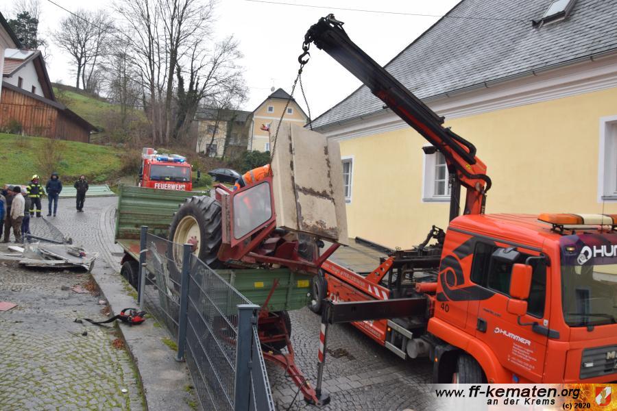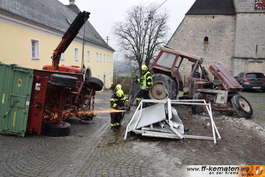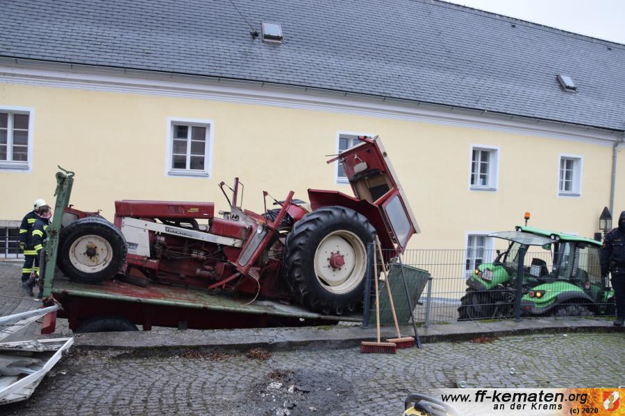 Ein Traktorgespann geriet in der Römerstraße außer Kontrolle und kollidierte am Kirchenplatz mit einem Gebäude.