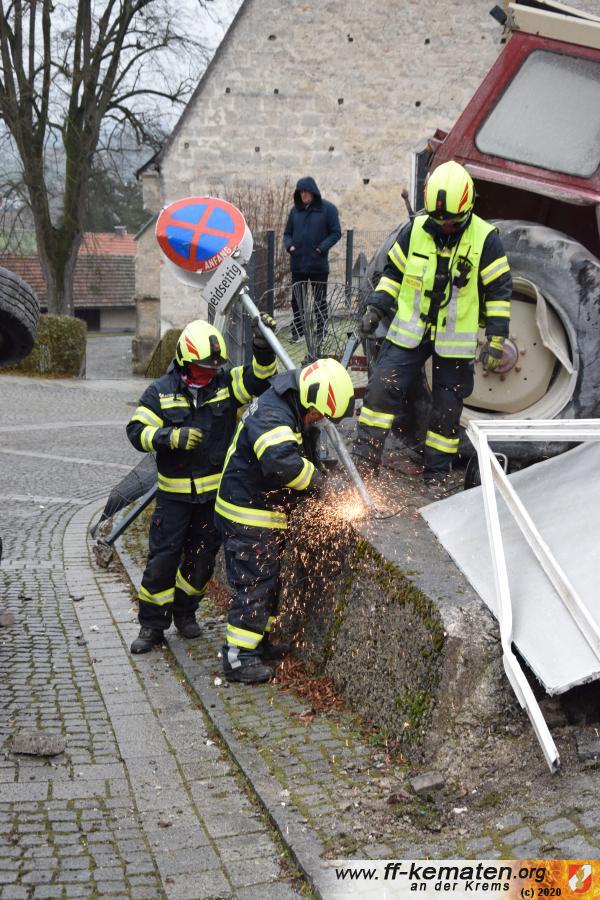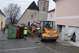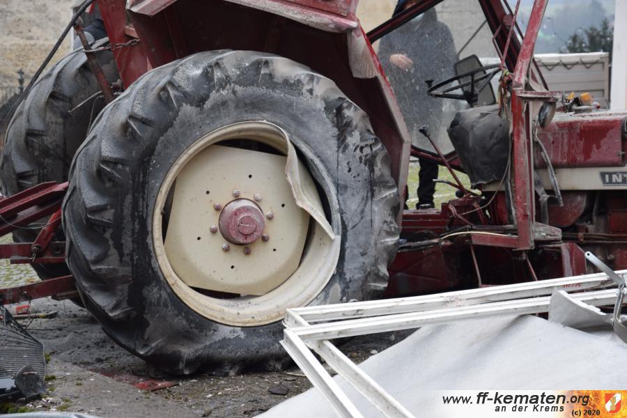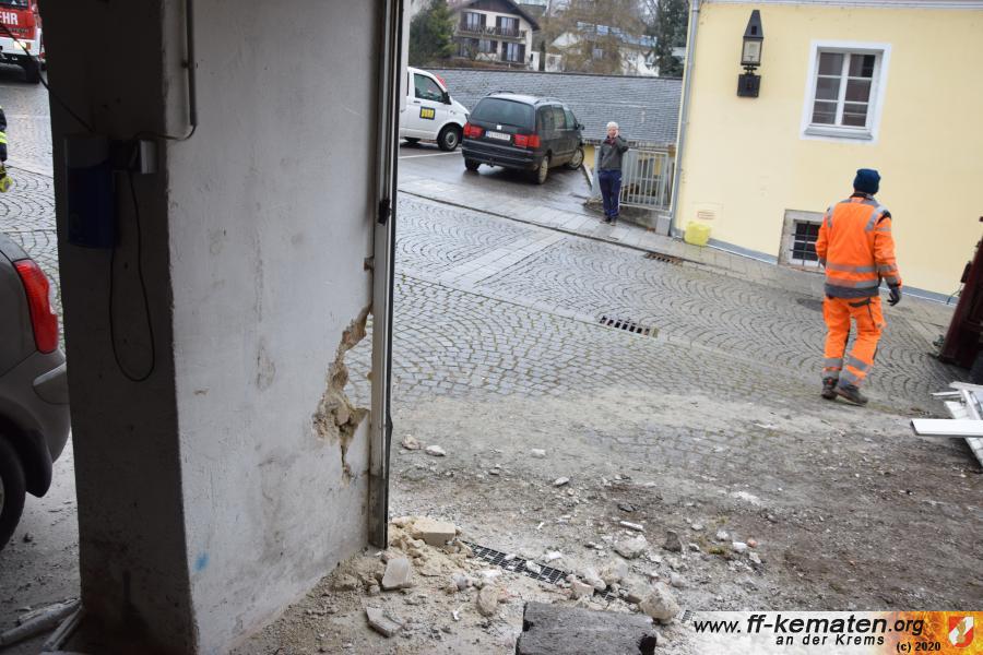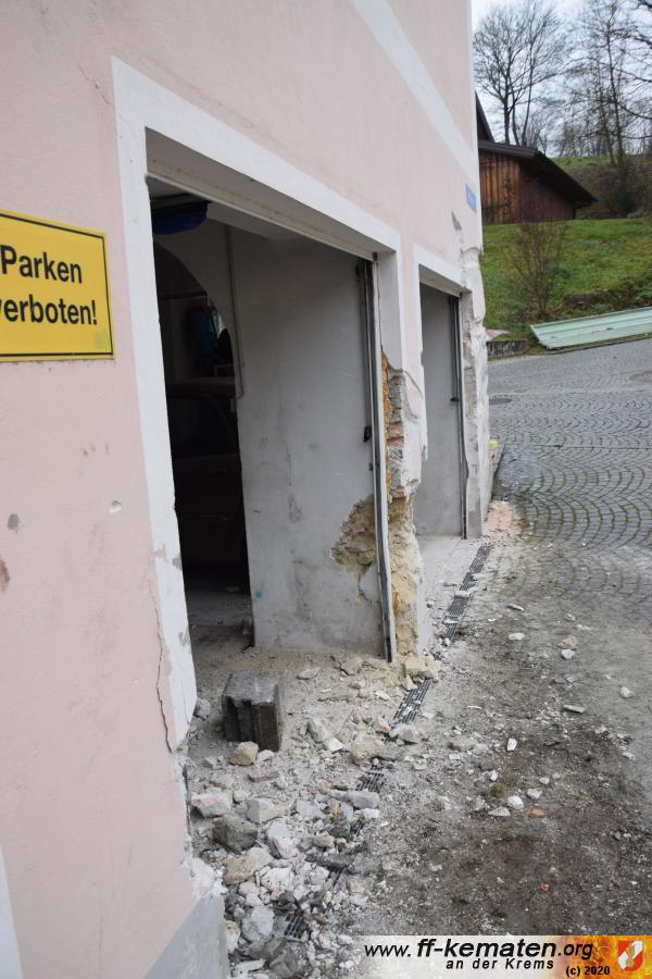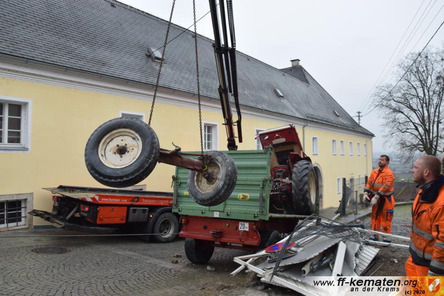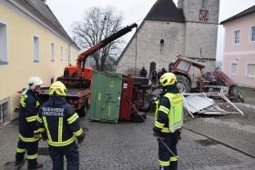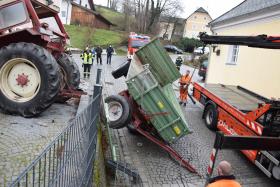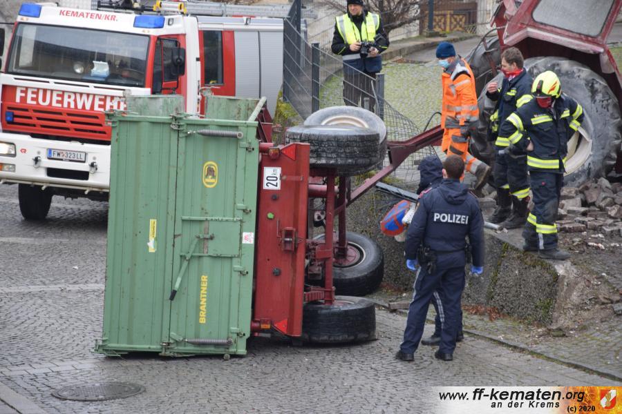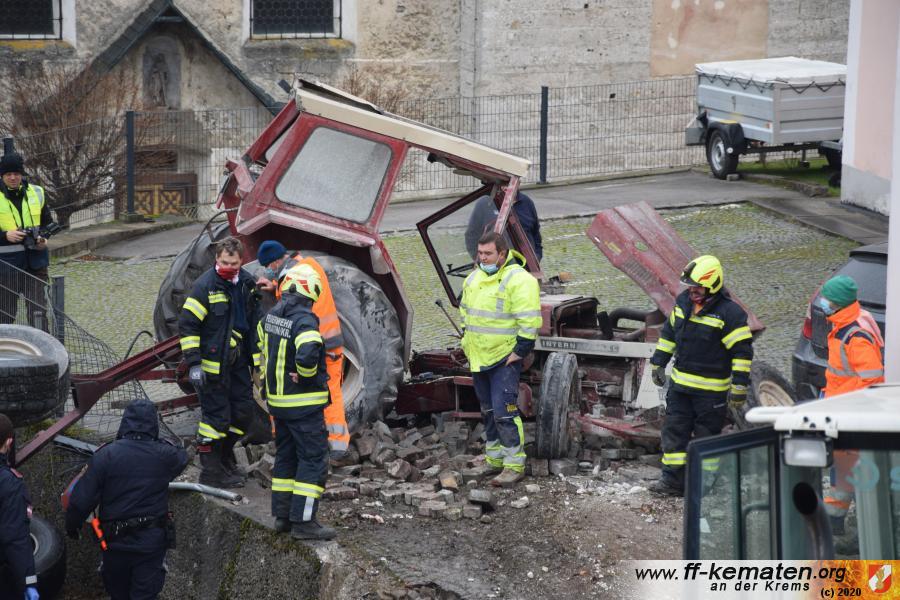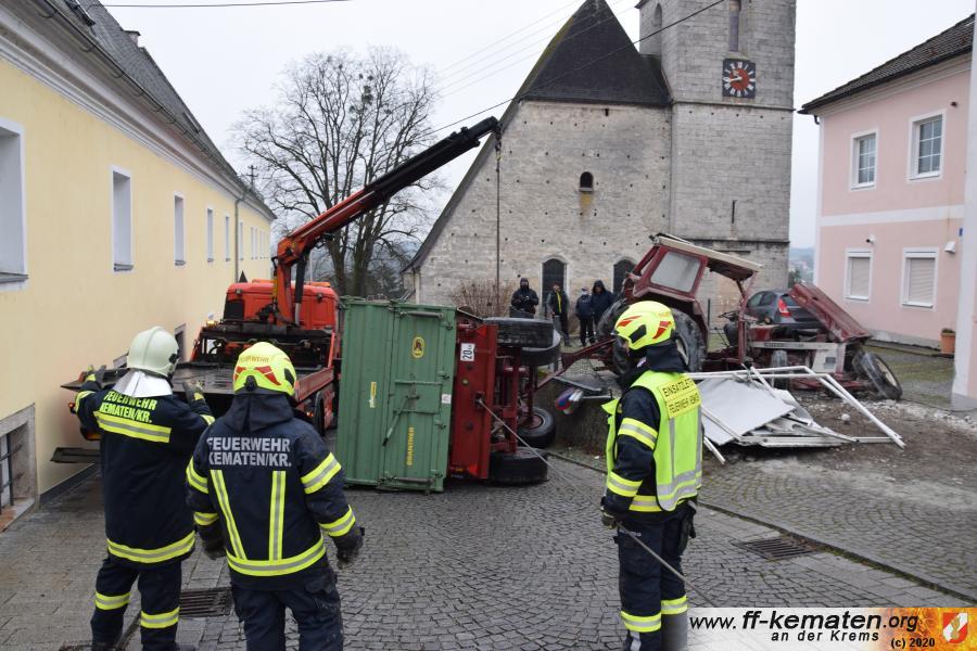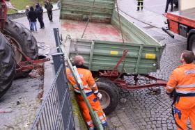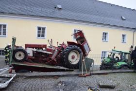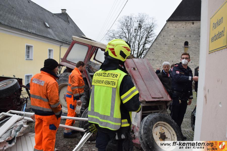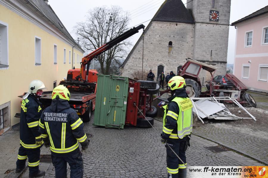 Ein Traktorgespann geriet in der Römerstraße außer Kontrolle und kollidierte am Kirchenplatz mit einem Gebäude.