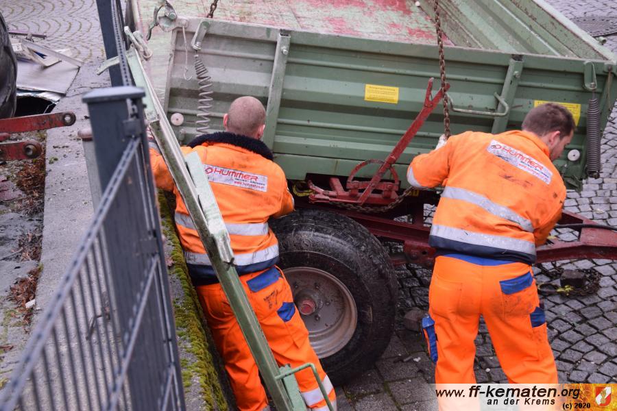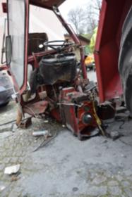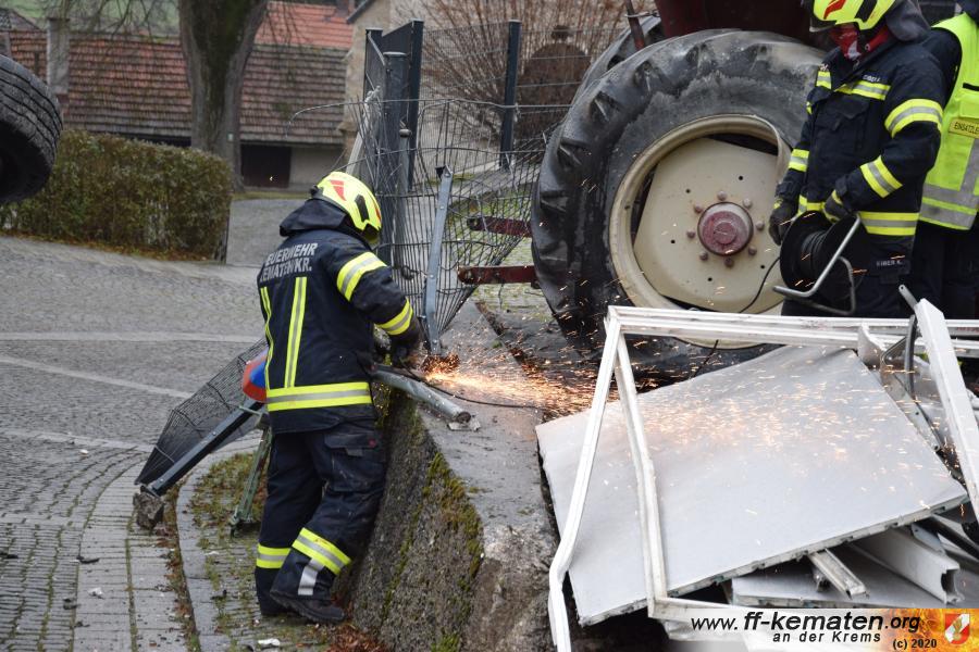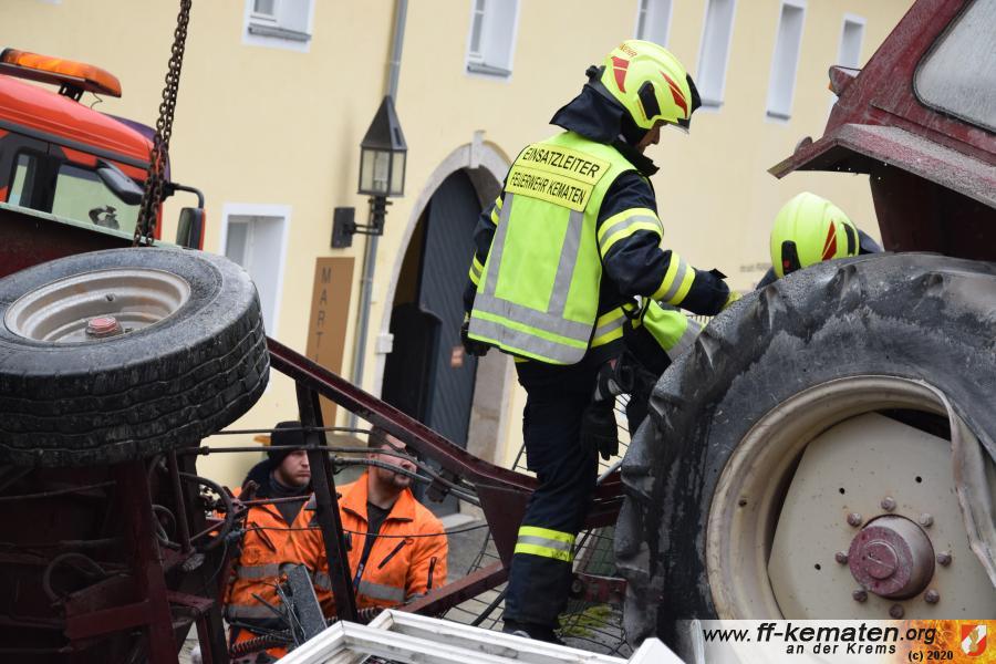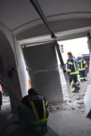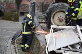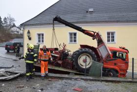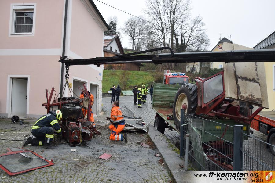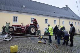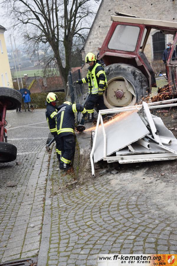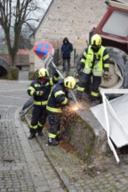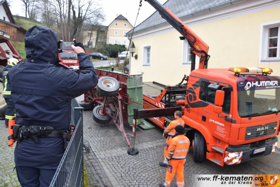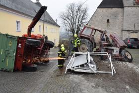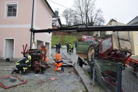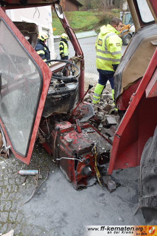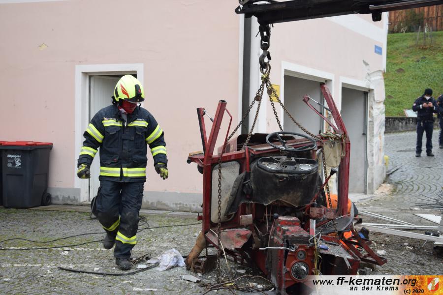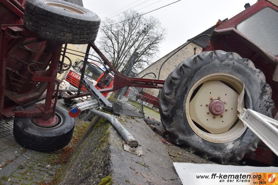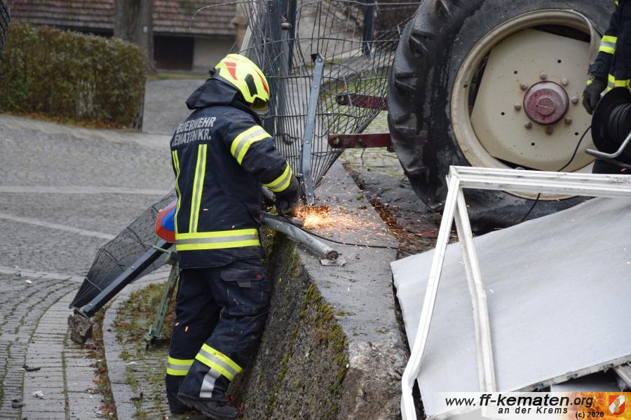 Ein Traktorgespann geriet in der Römerstraße außer Kontrolle und kollidierte am Kirchenplatz mit einem Gebäude.
